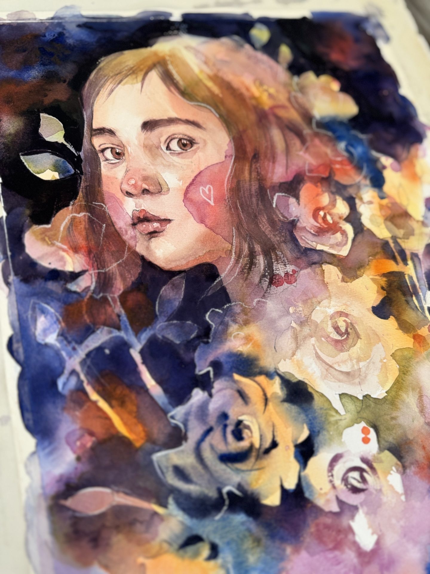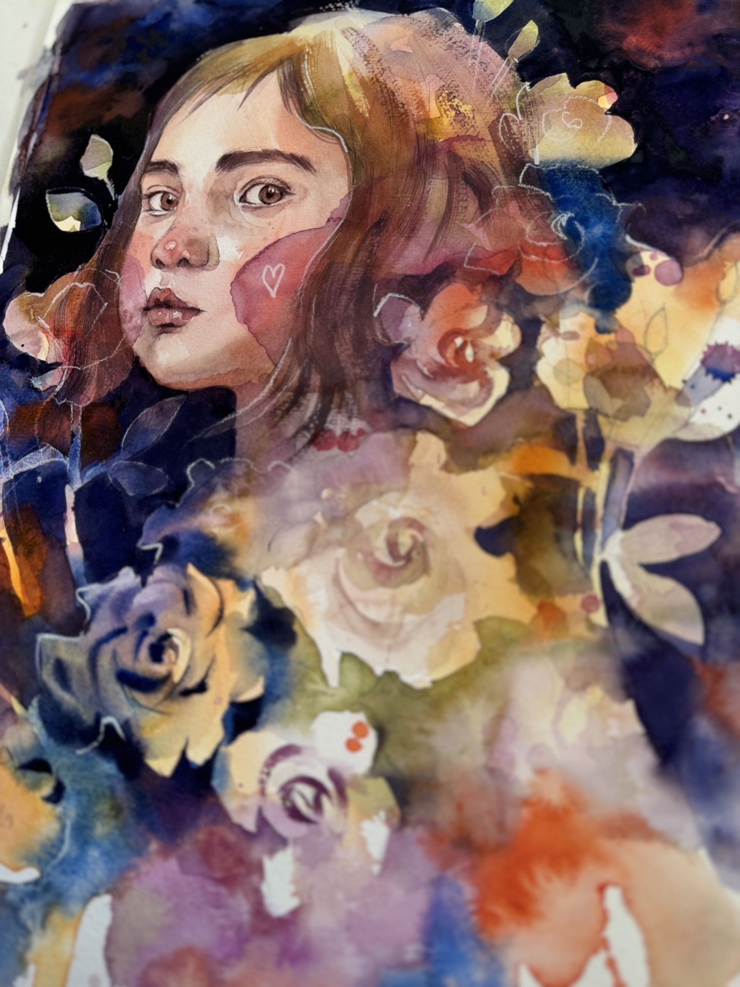 Akvarel, Dievčatko s pehami, obklopené ružami. Rozmer diela 36x26 cm, v čiernej pasparte.