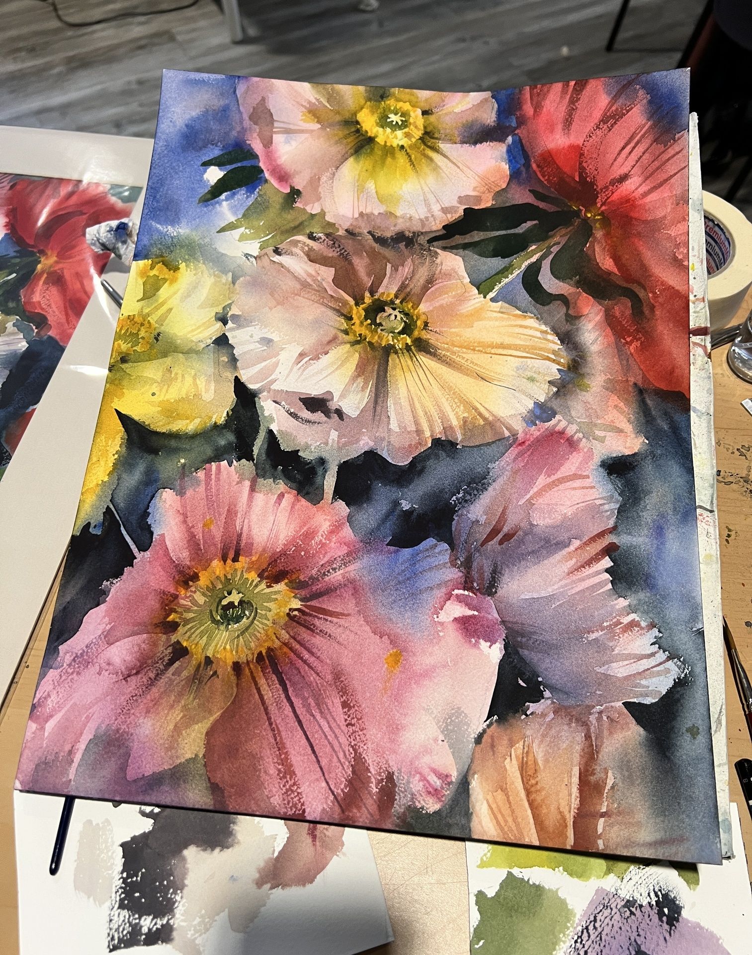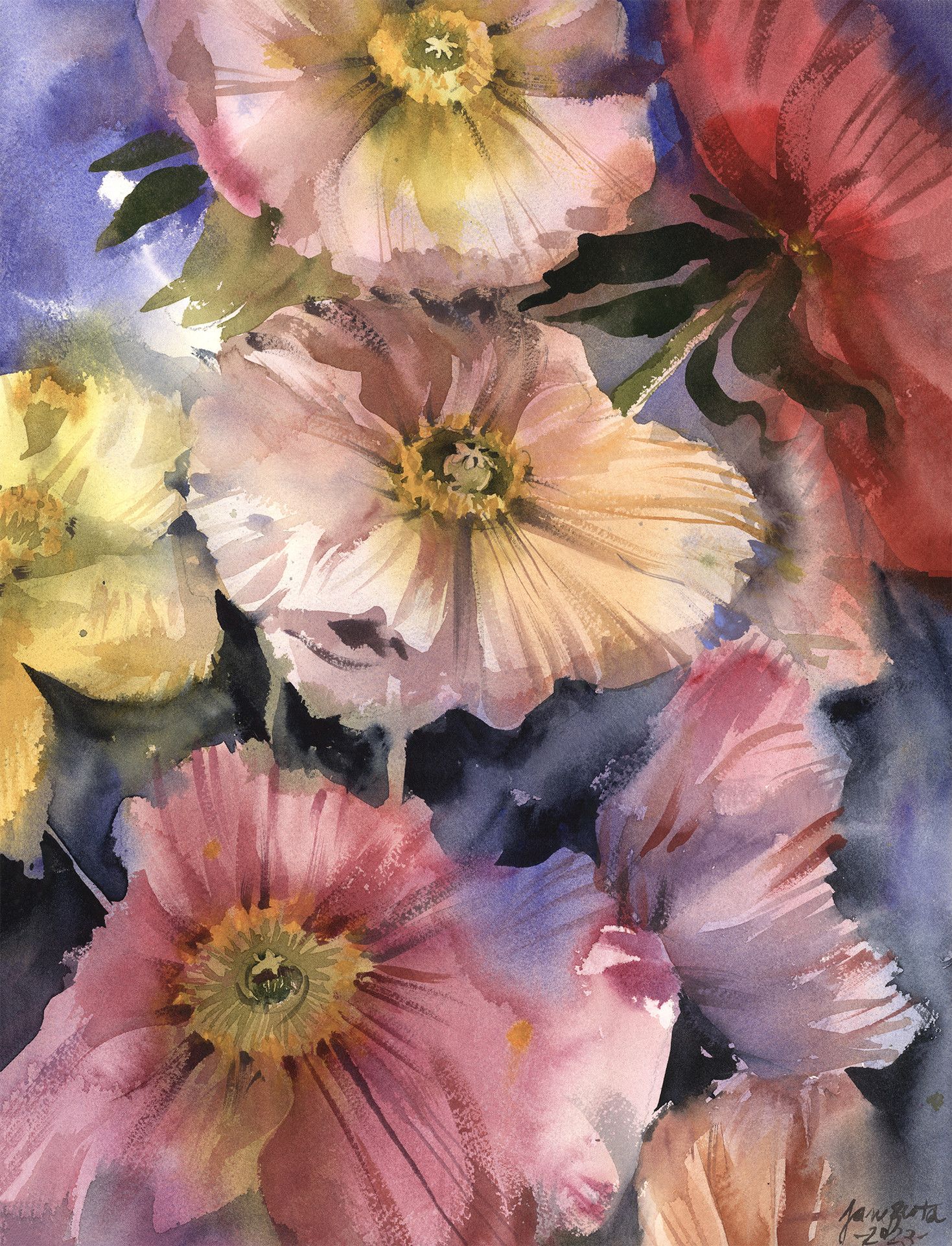 Akvarel, maky rôznych farieb, rozmer diela 40x30 cm, v čiernej pasparte 50x40 cm.