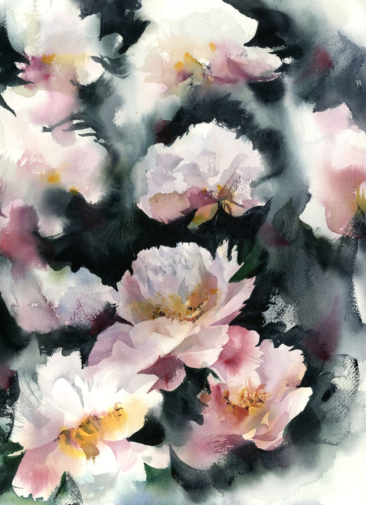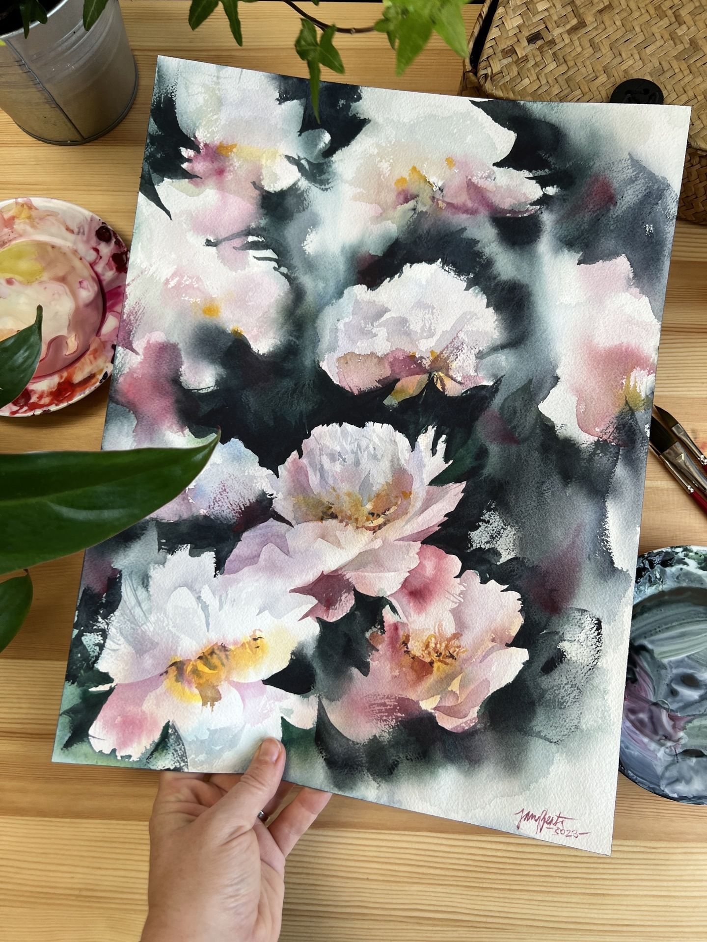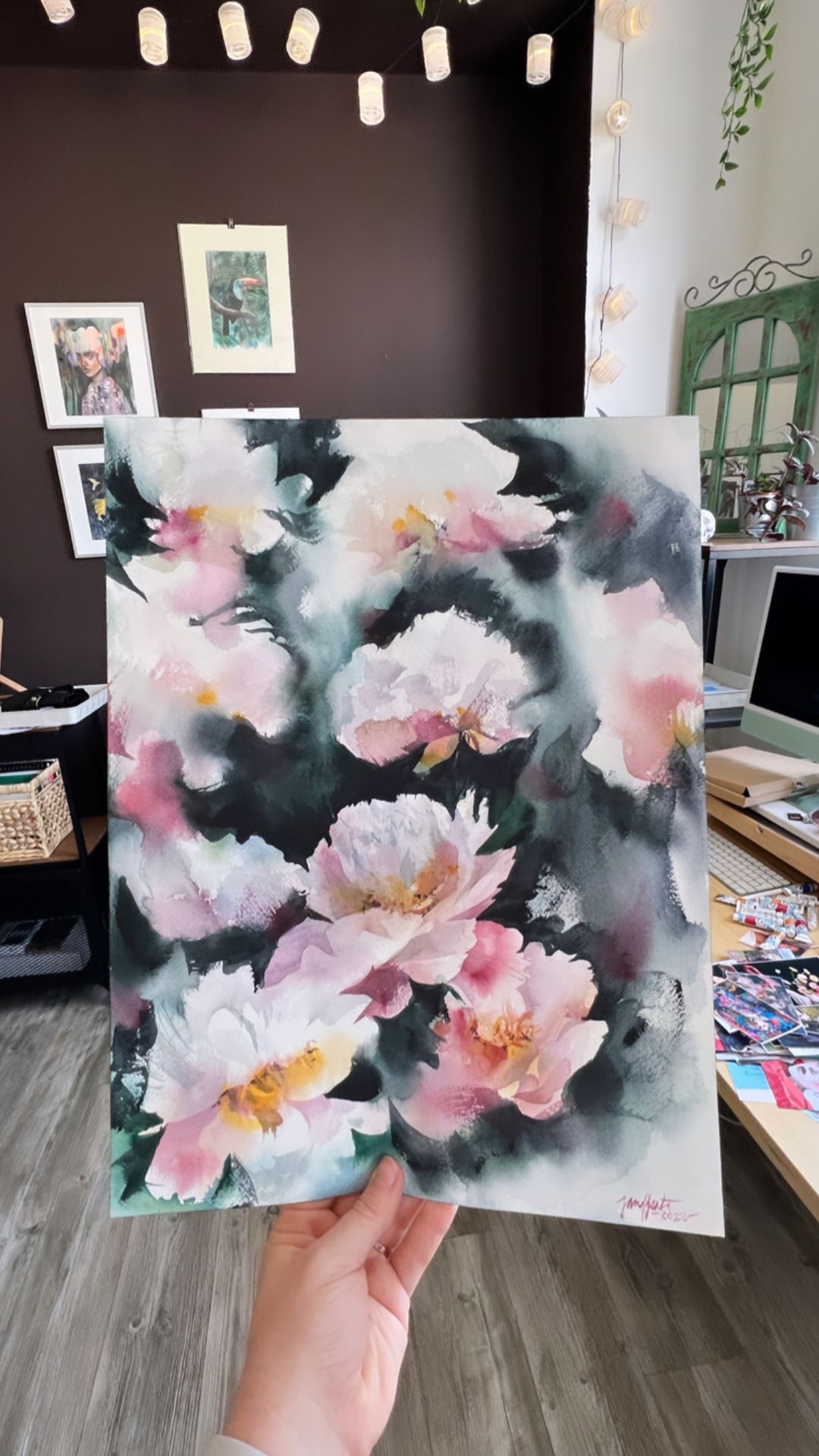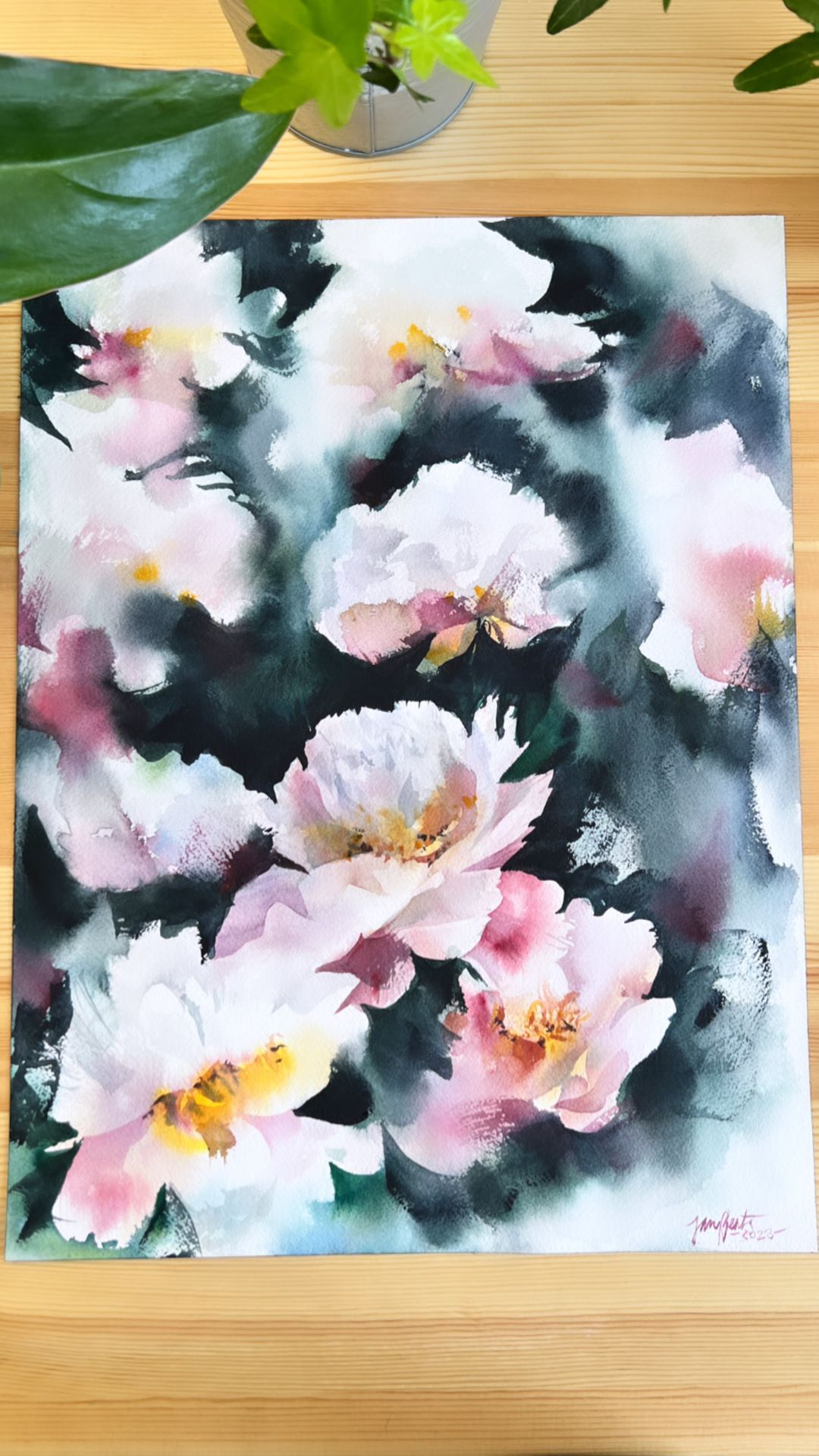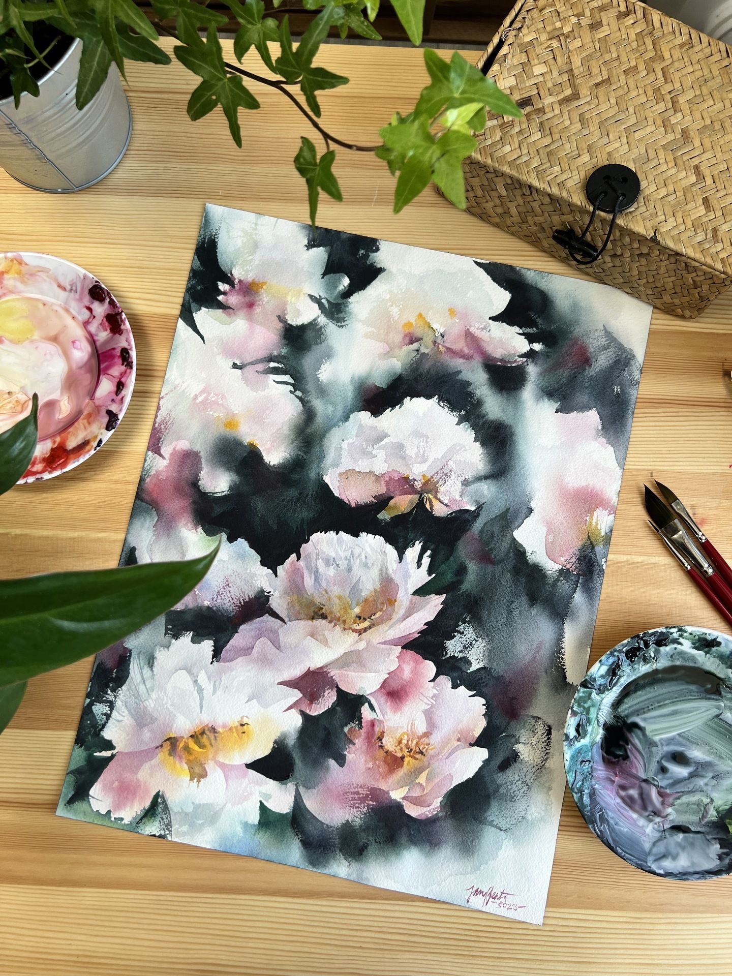 Akvarel, rozkvitnuté bielo-rúžové pivonky, rozmer diela 40x30 cm v bordovej pasparte 50x40 cm.