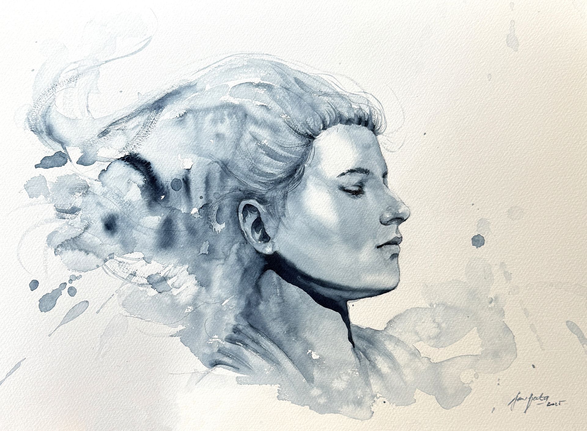 Portrét monochrom - akvarel, profil dievčaťa s rozviatymi vlasmi, rozmer diela 30x40 cm, v čiernej pasparte 40x50 cm. Dielo vyniká svojou jemnosťou techniky maľby akvarelom a svojou harmonickou atmosférou, ktorá je posilnená použitím minimálneho množstva farieb. Originál s jedinečným rukopisom autora, ideálny ako zberateľský kúsok alebo dizajnový doplnok interiéru.