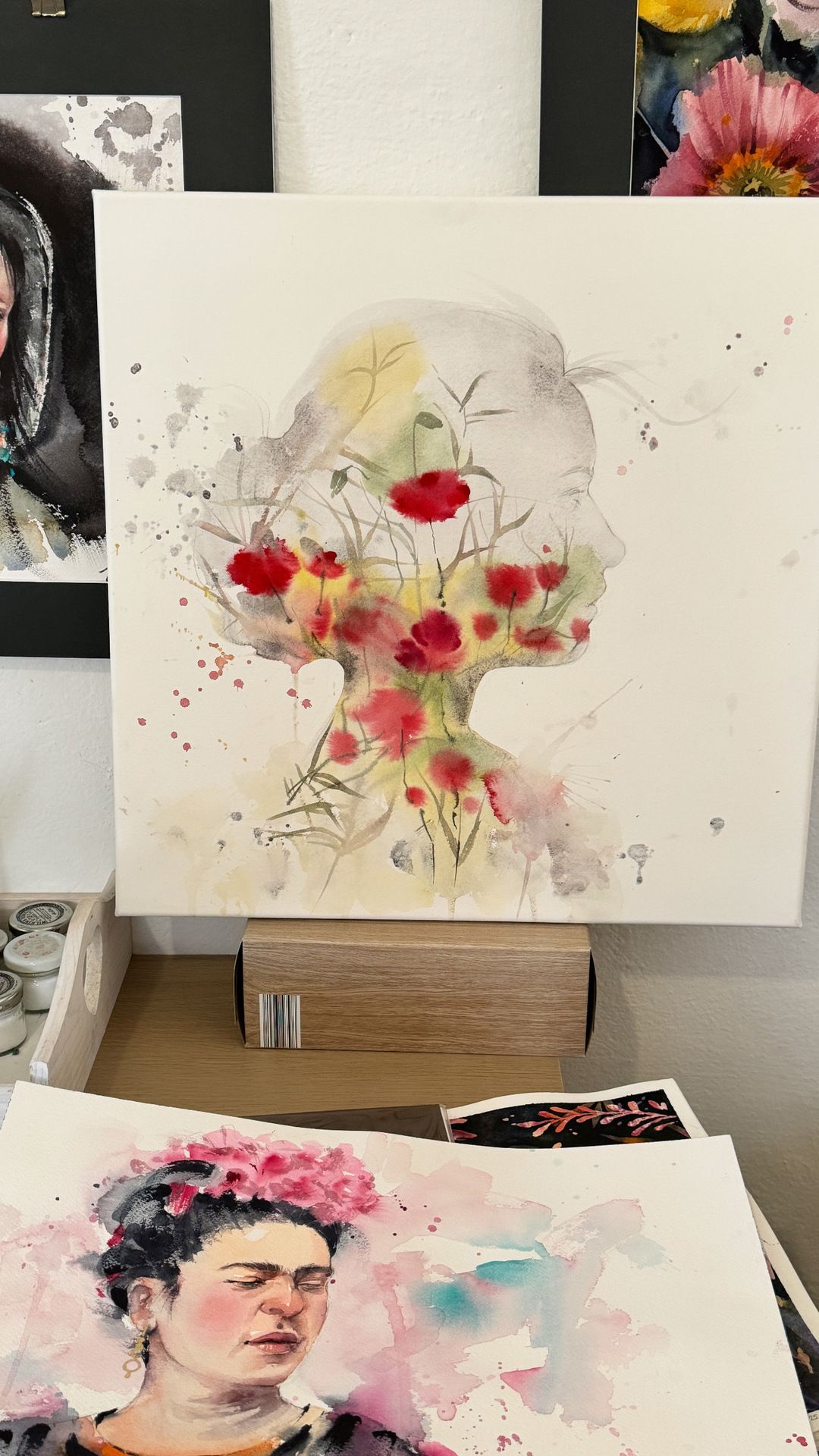 Akvarel, Profil portrét na napnutom bavlnenom papieri, štvorcový formát (2024), rozmer diela 45x44 cm.