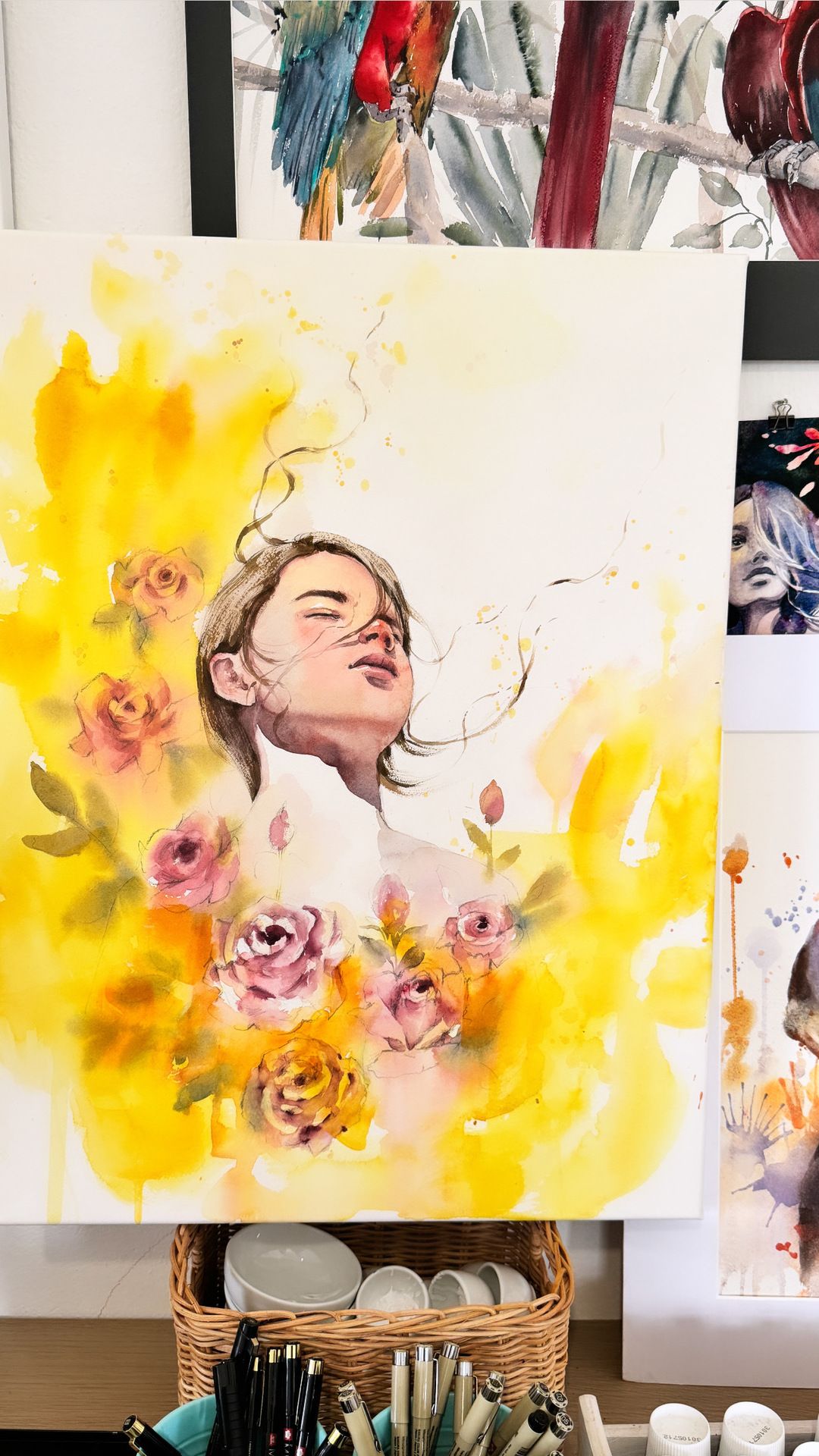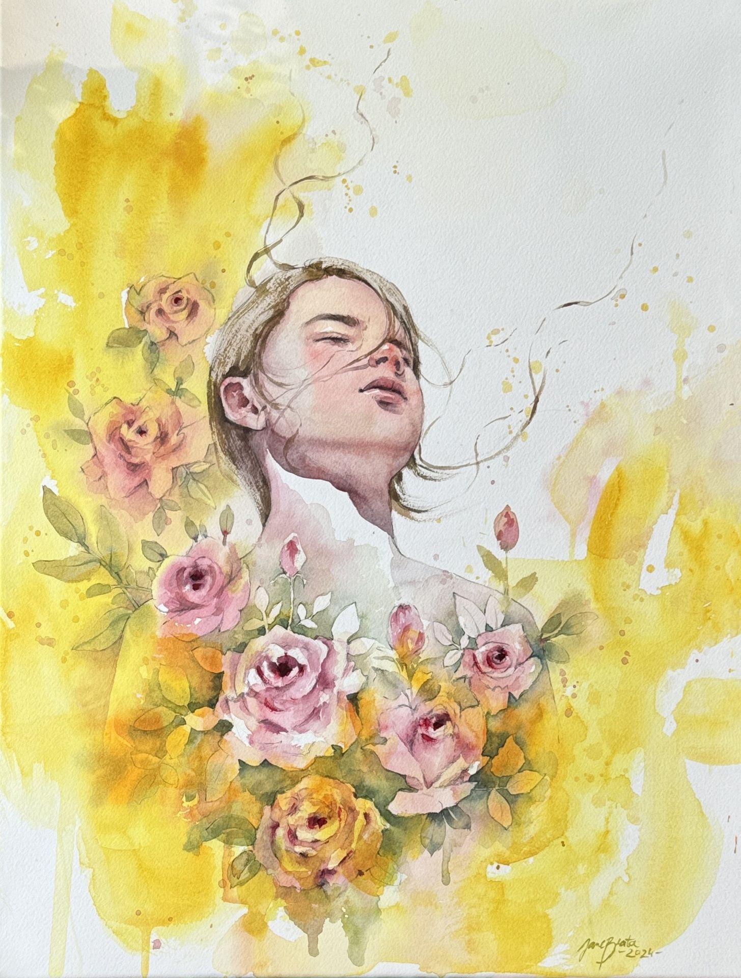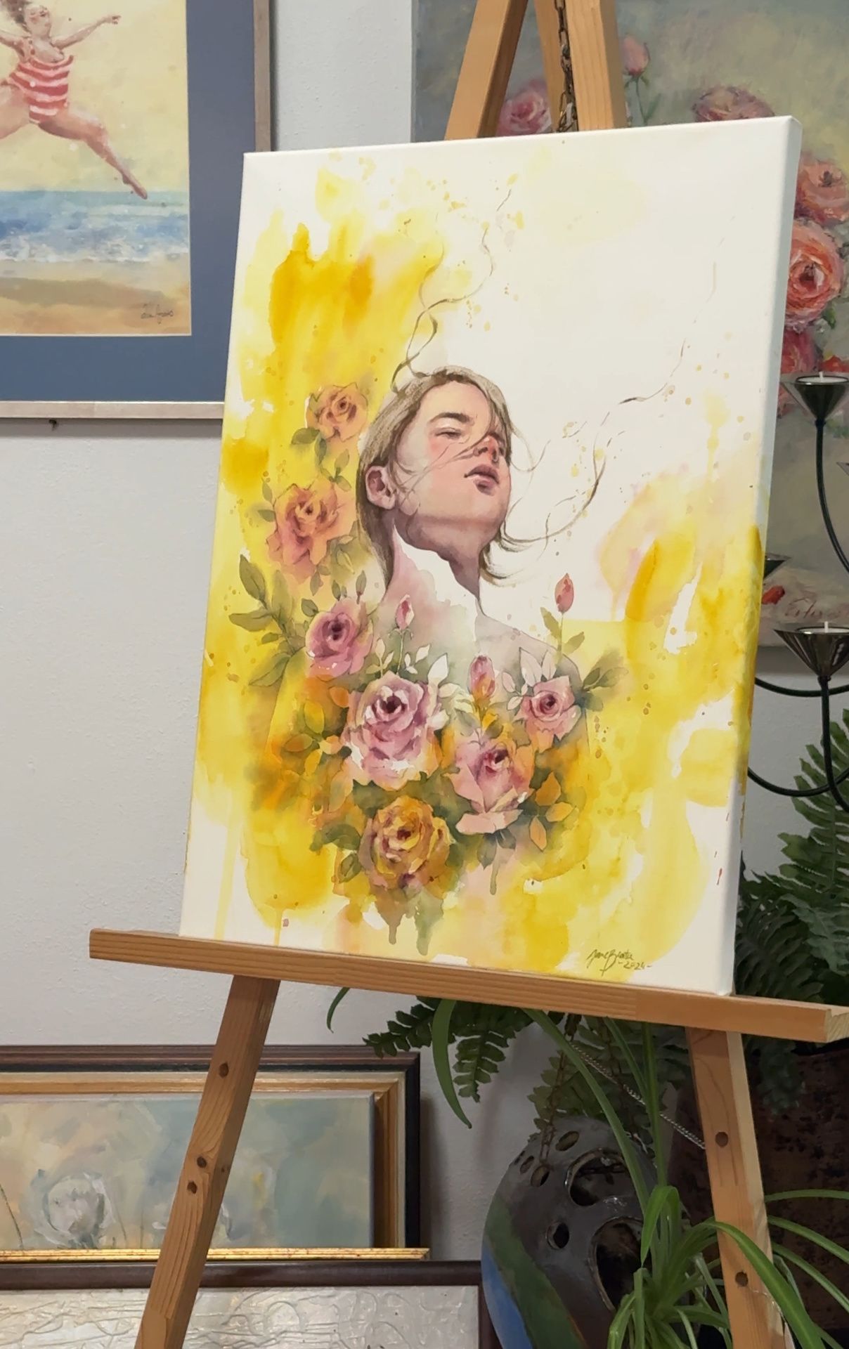 Akvarel, Profil portrét na napnutom bavlnenom papieri, rozmer diela 60x45 cm.