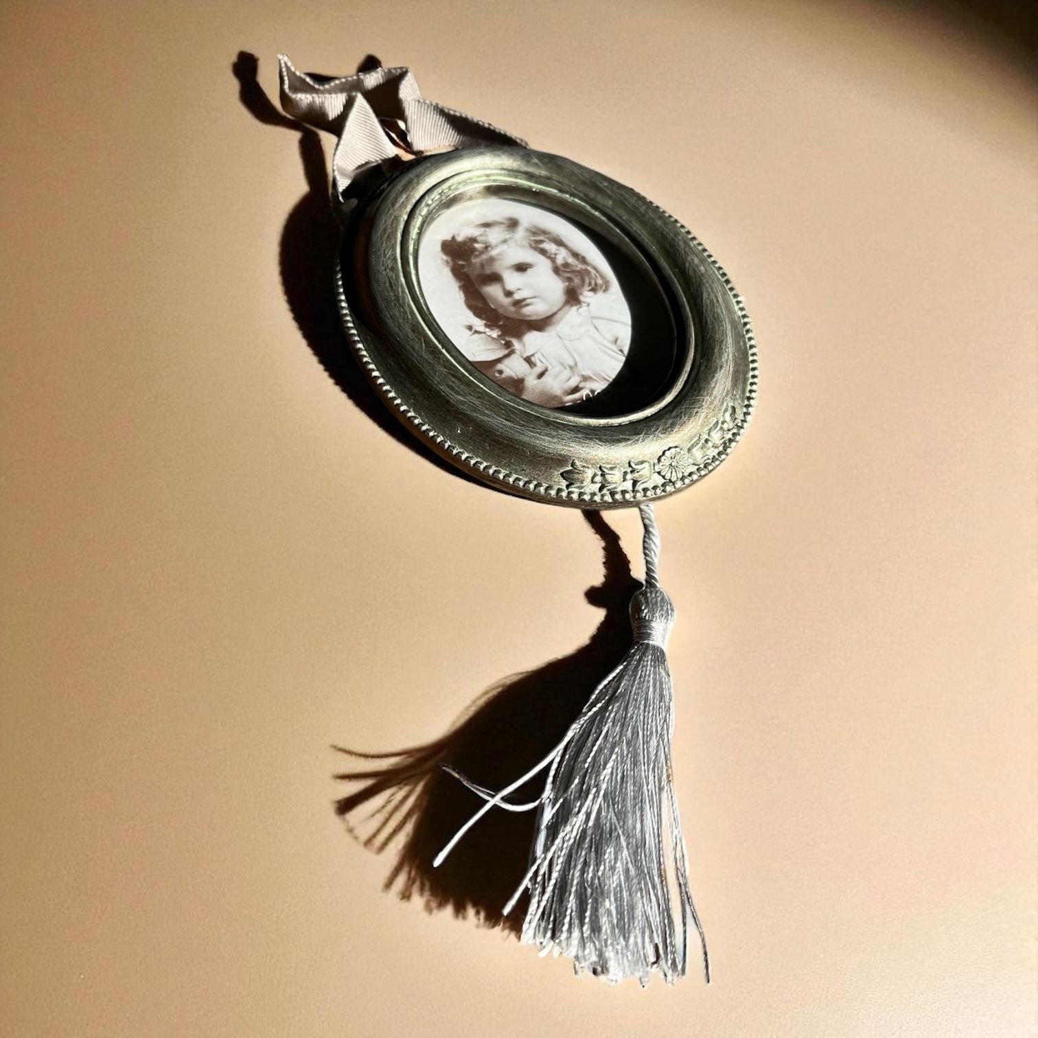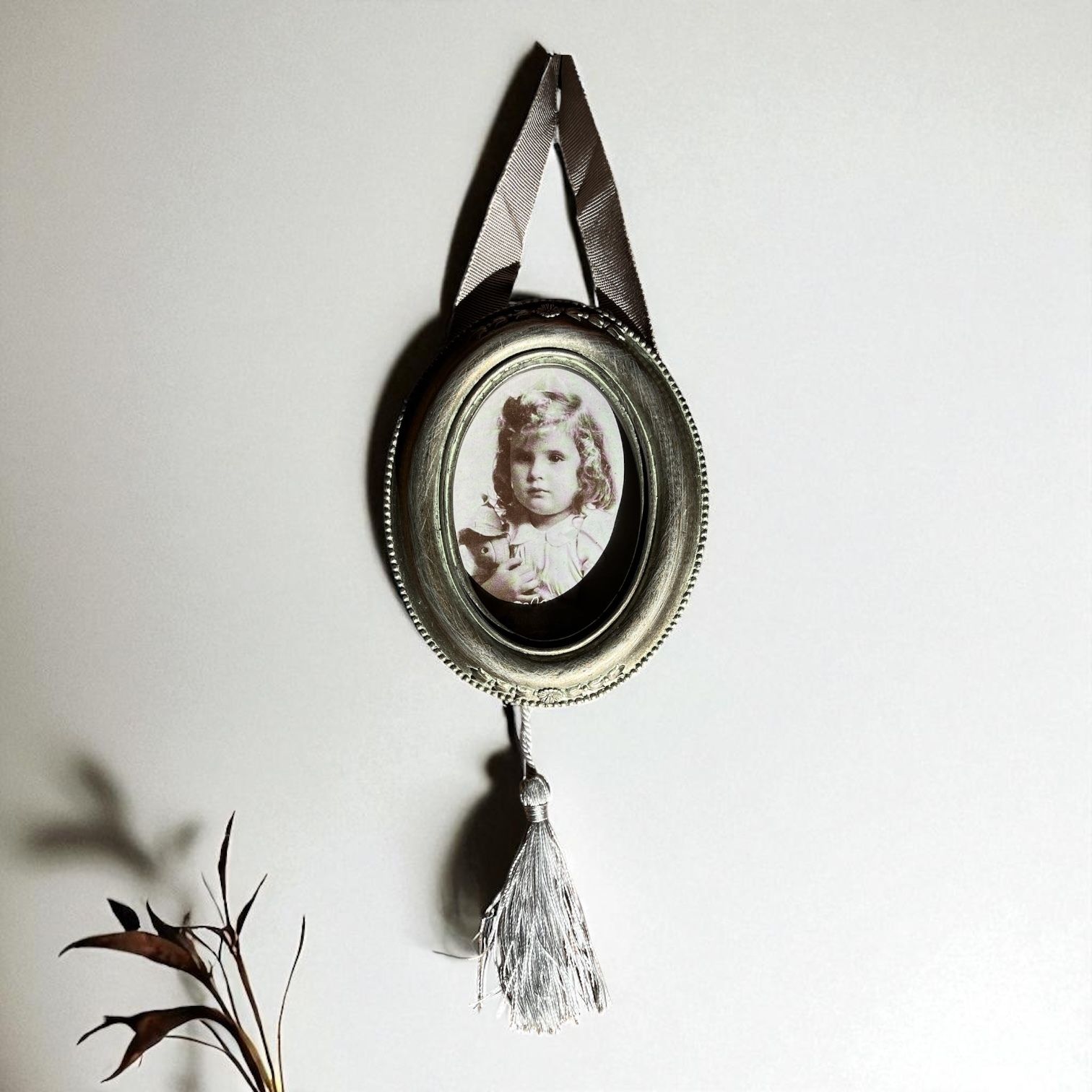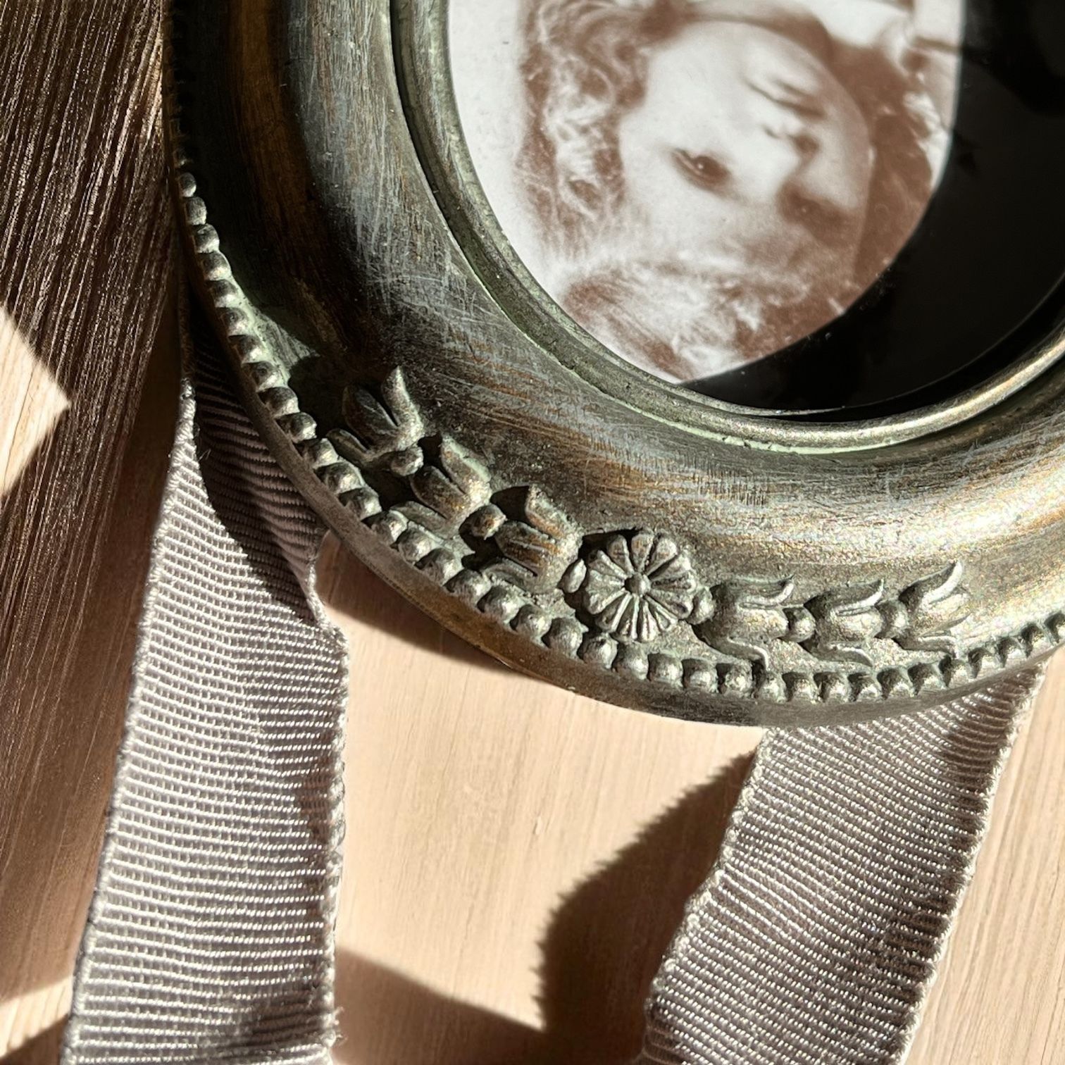 Rámik na fotografiu v oválnom tvare vyzerá starožitne. 12x10 cm.