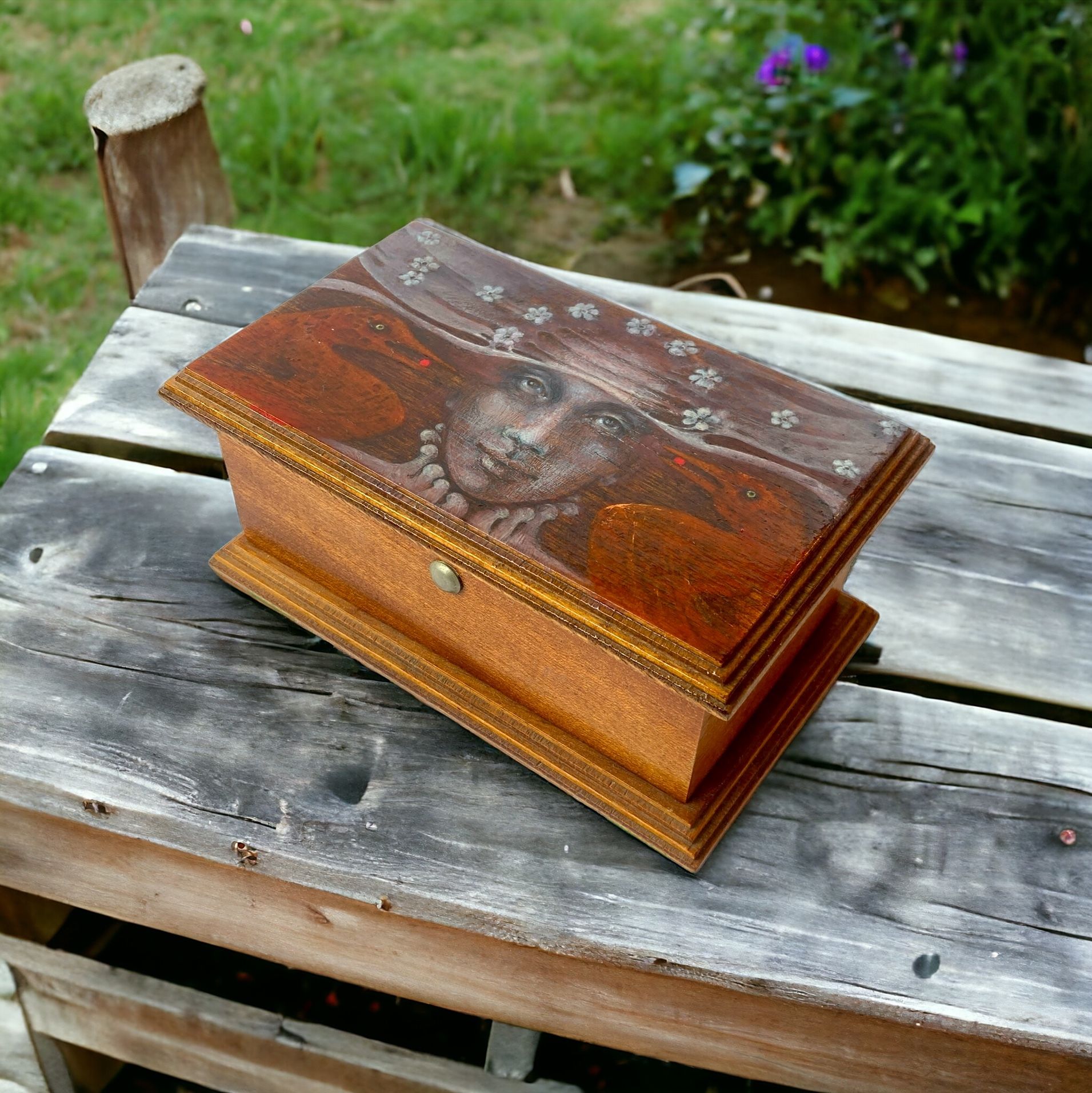 Drevená hracia skrinka. Rozmer je 10,5 x 17 x 8,5 cm.
