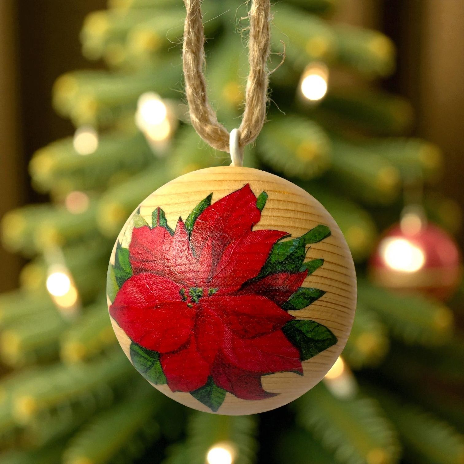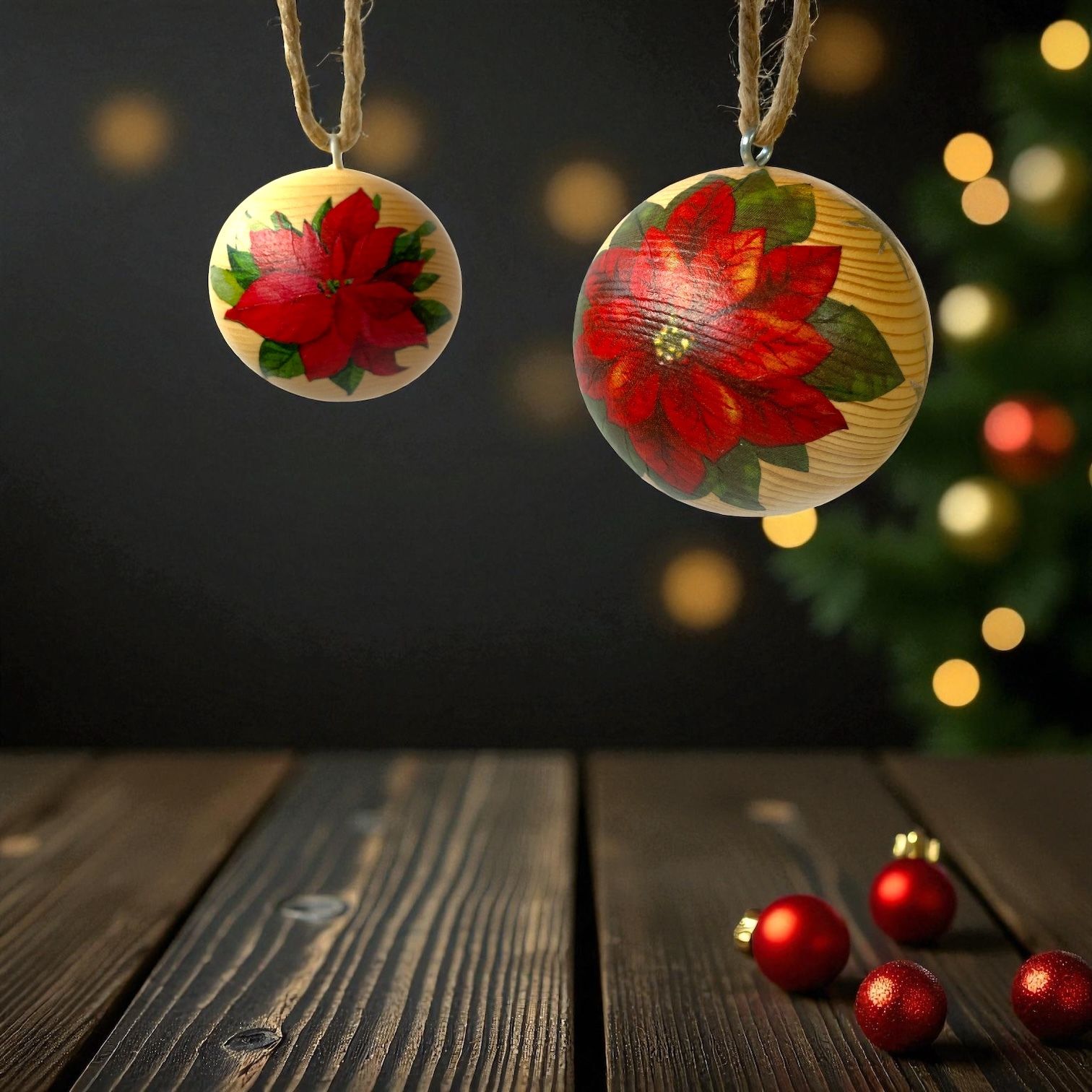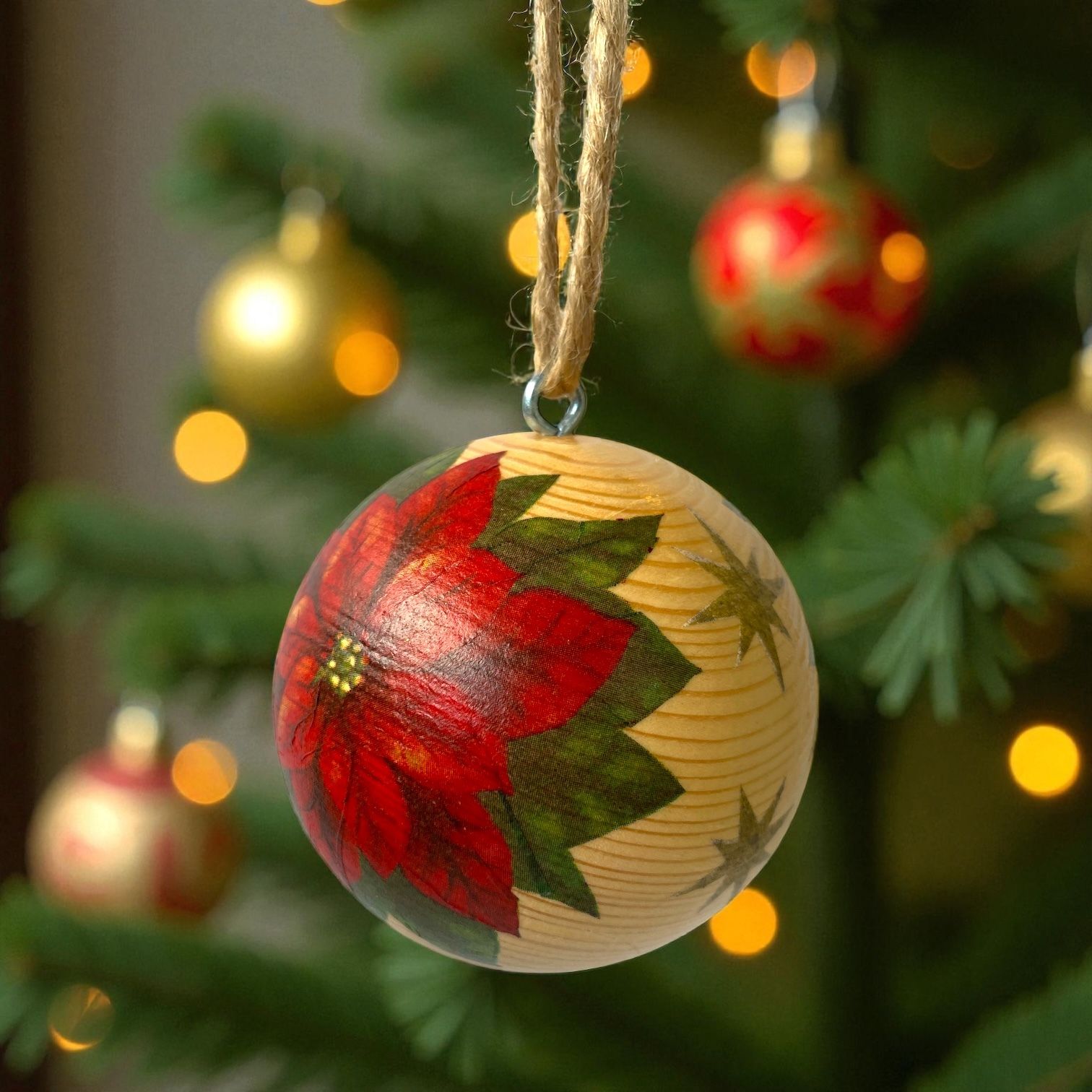 Vysústružená drevená guľa v dvoch veľkostiach s namaľovaným kvetom vianočnej ruže so striebornými hviezdičkami.