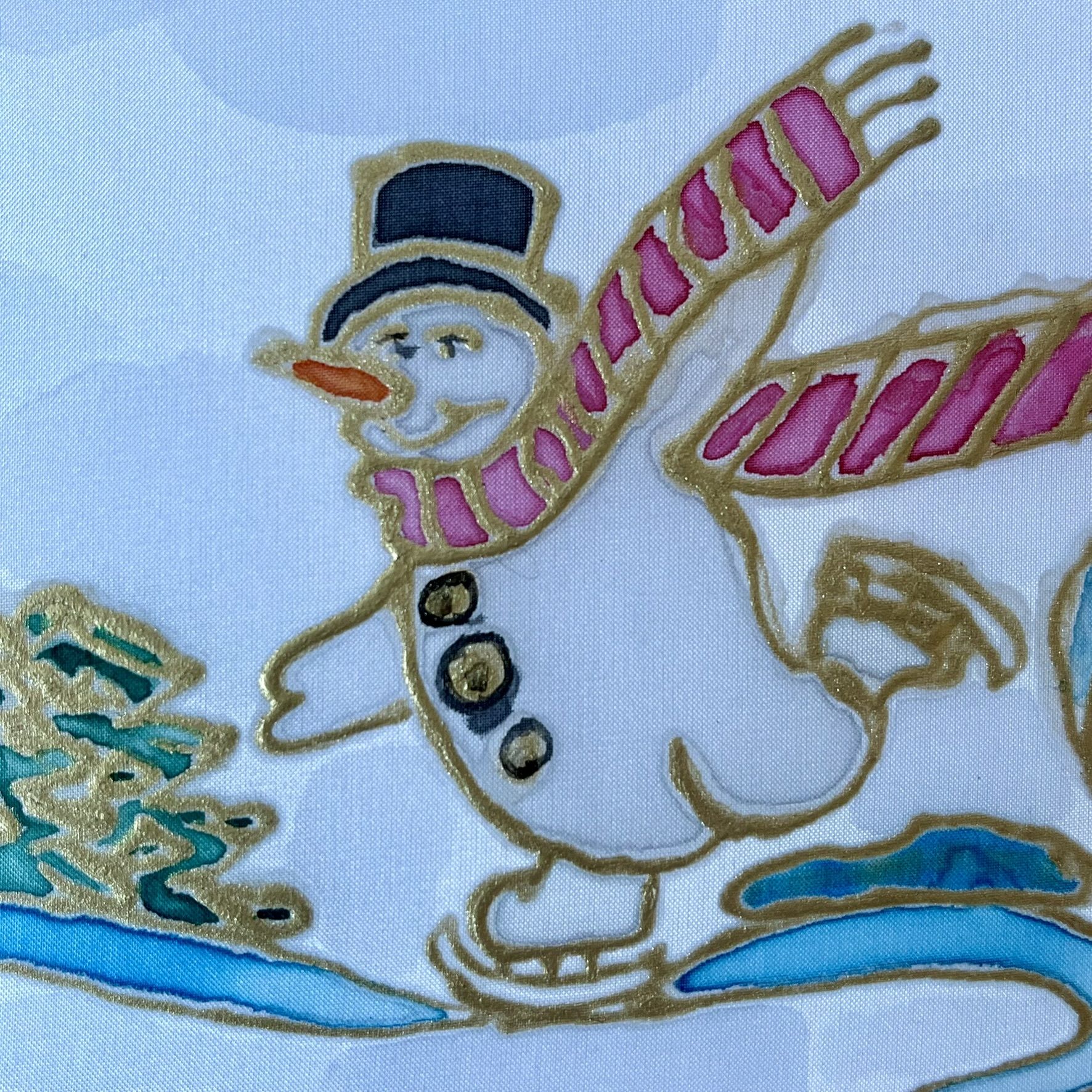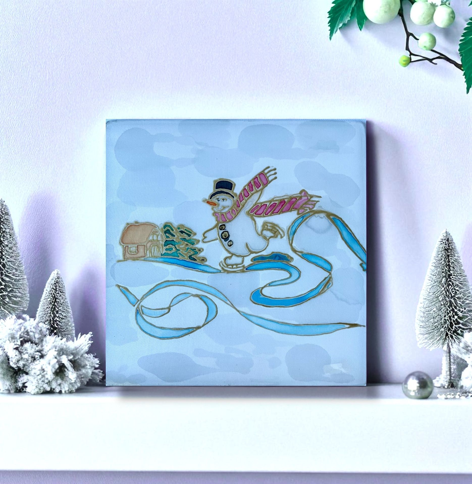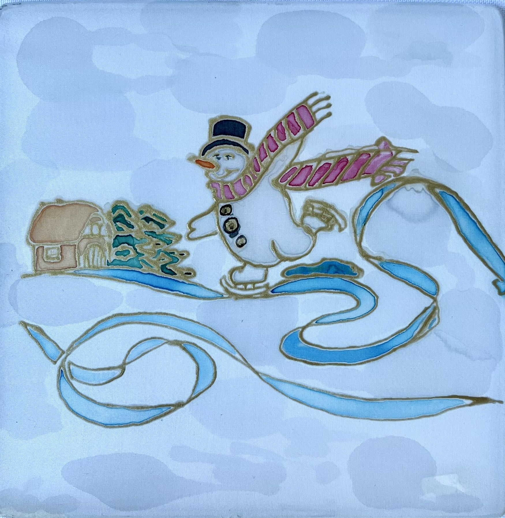 Milý obrázok maľovaný na hodvábe zobrazuje veselého snehuliaka na korčuliach, 20x20 cm.