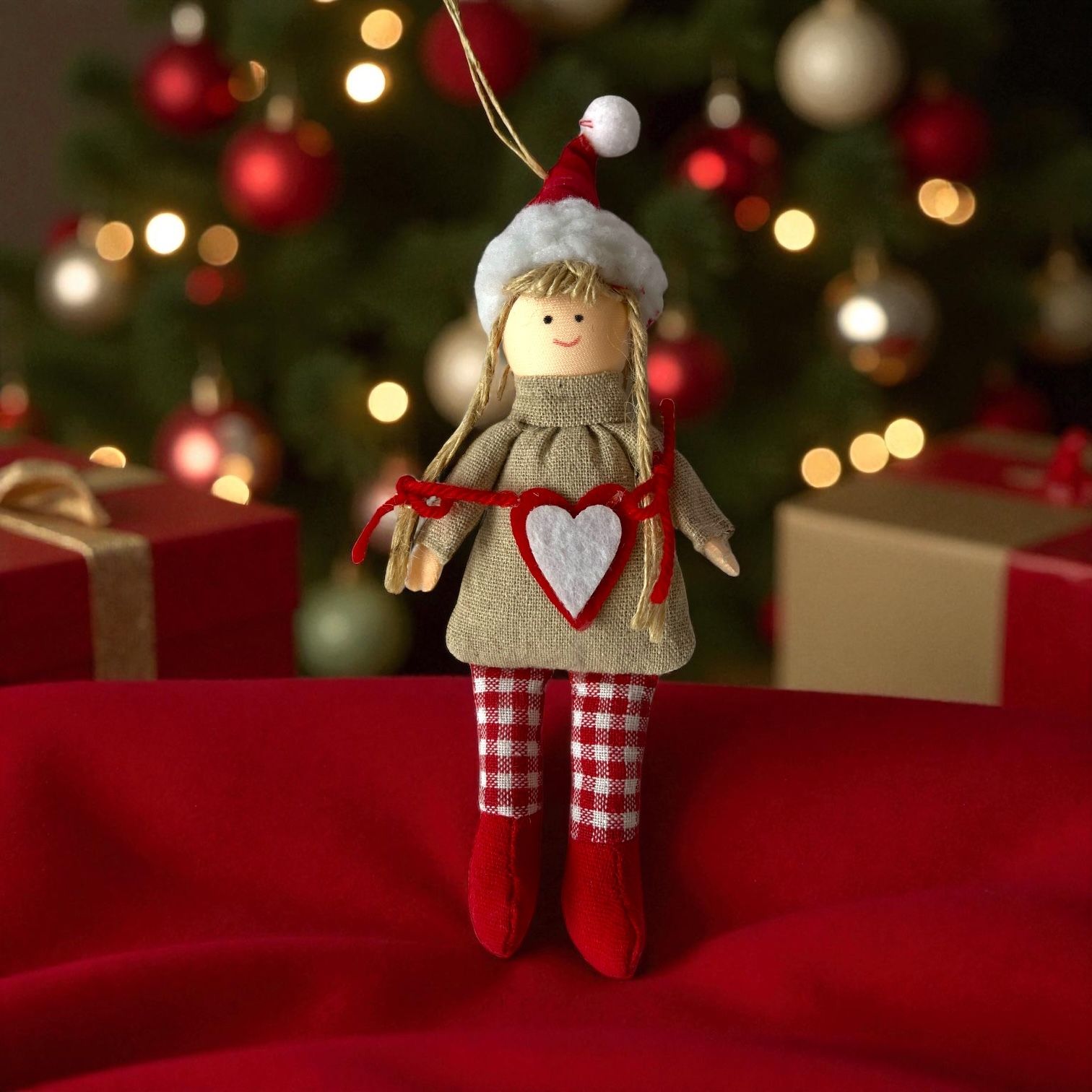 Malá bábika so srdiečkom na šatách v mikulášskej čapici na vianočný stromček. Výška 20 cm.