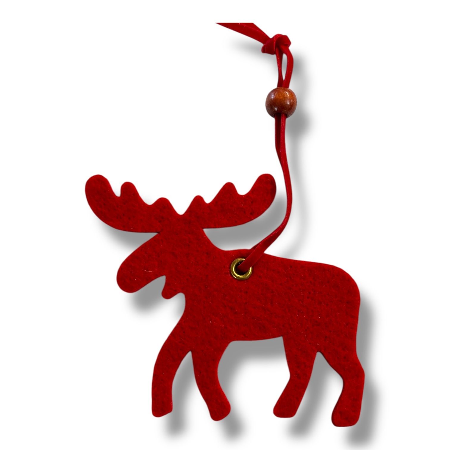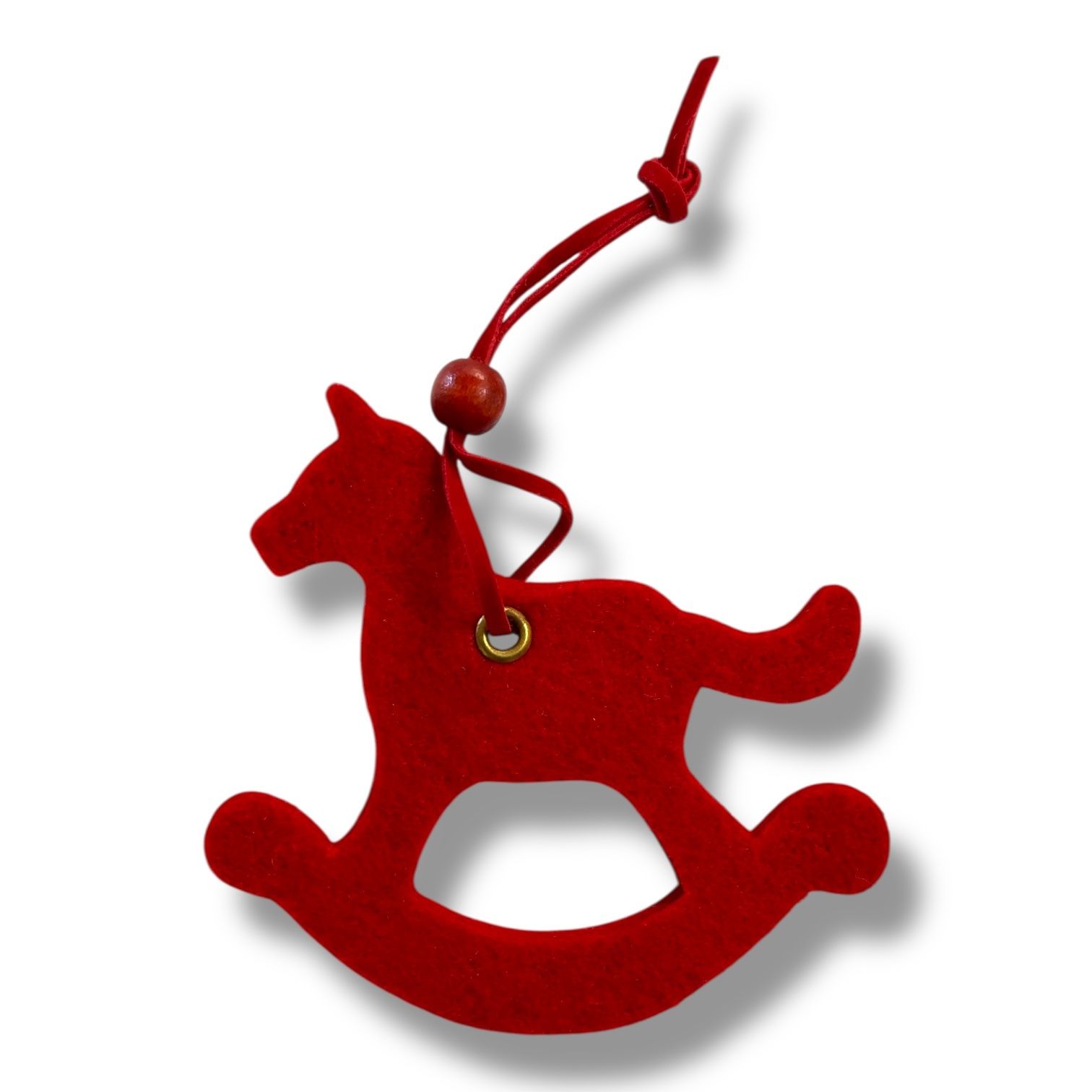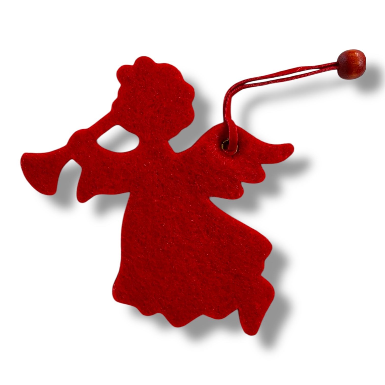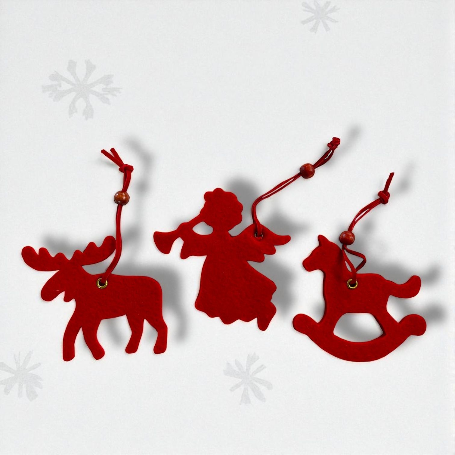 Ozdoba na stromček alebo okno z červenej plste, anjelik s trubkou, hojdací koník a sob, cca 8 cm.