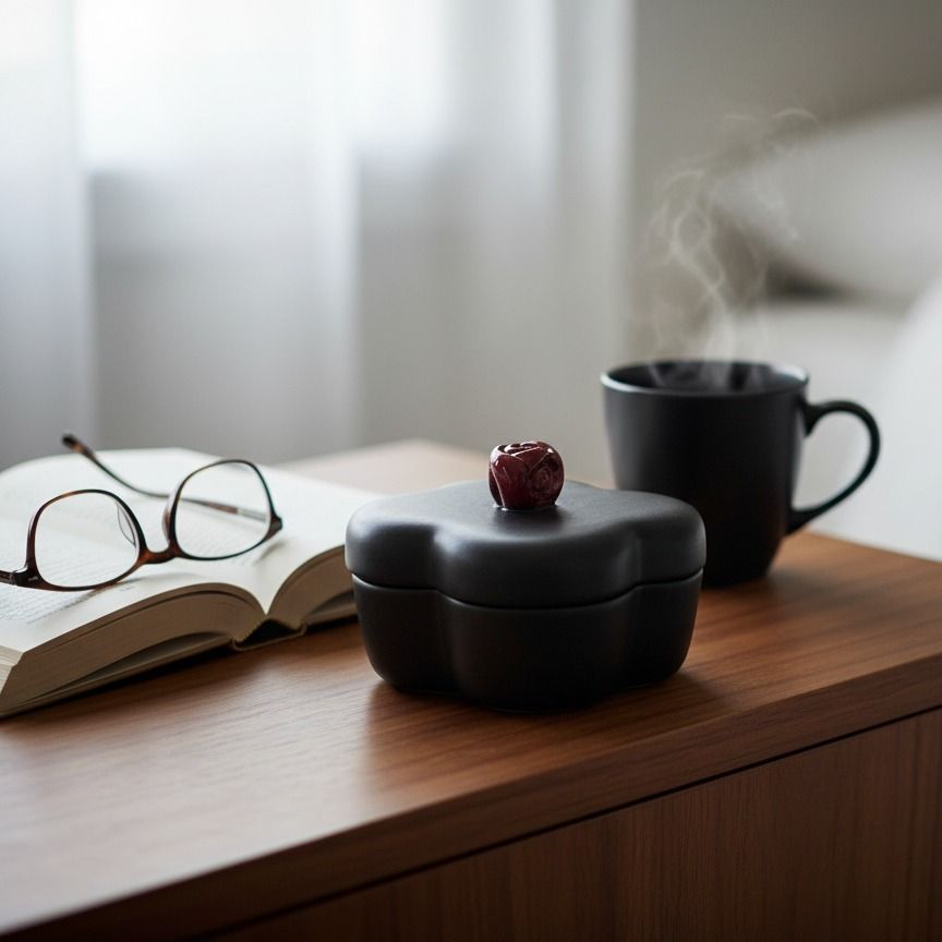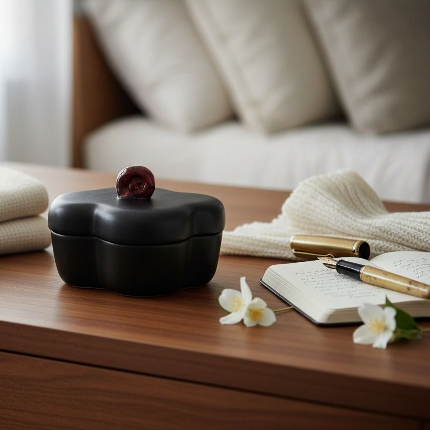 Štýlová čierna keramická dóza s minimalistickým dizajnom — ideálna na drobné šperky, čaj, cukríky alebo osobné drobnosti. Rozmery: priemer 10 × 8 cm, výška 8,5 cm. Elegantný a praktický doplnok do domácnosti, ktorý poteší aj ako darček.