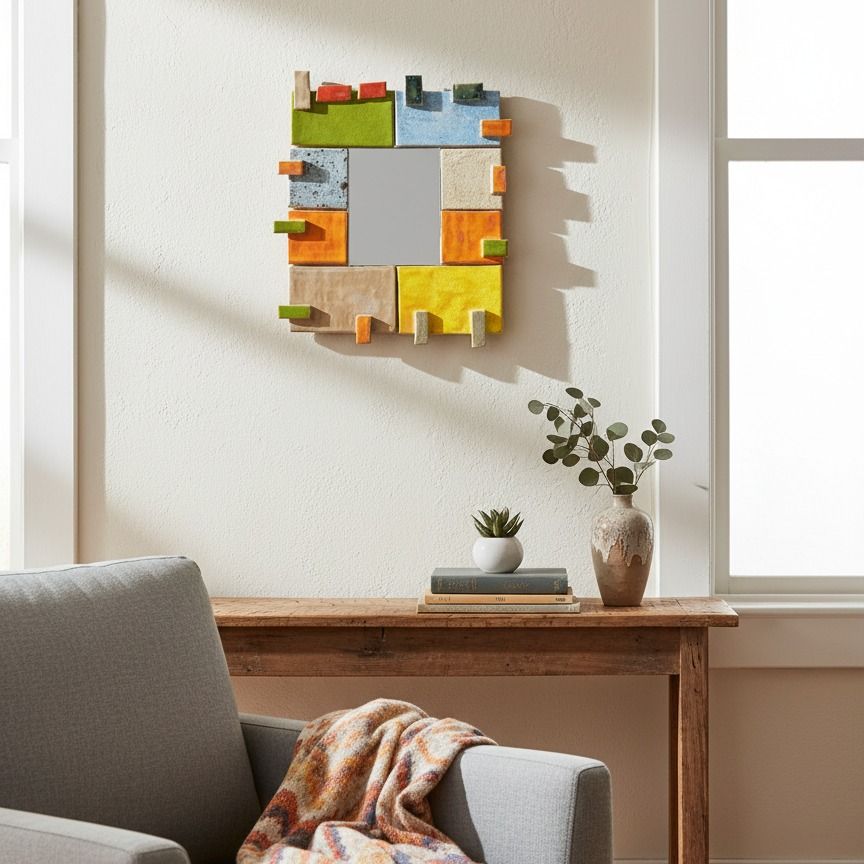 Ručne vyrobené keramické zrkadlo s dekoratívnymi výčnelkami – originálny a osobitý doplnok do domácnosti alebo ako darček. Zrkadlové sklo 10 × 13 cm, celkový rozmer s rámom 30,5 × 26 cm. Každý kus je jedinečný, drobné odchýlky v tvare a glazúre podčiarkujú jeho remeselnú autenticitu.
