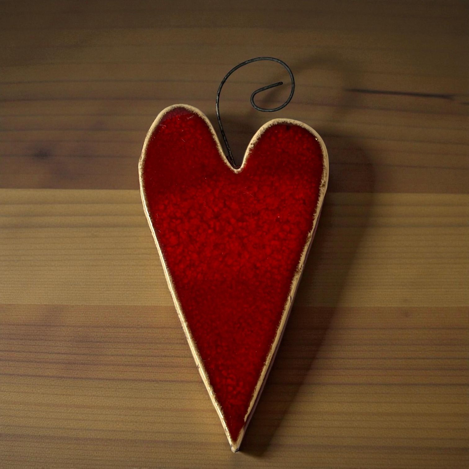 Romantické červené keramické srdce z dieľne In Viovu určený na zavesenie na stenu. Výšku má približne 10 cm, je z pálenej hliny s glazúrou.