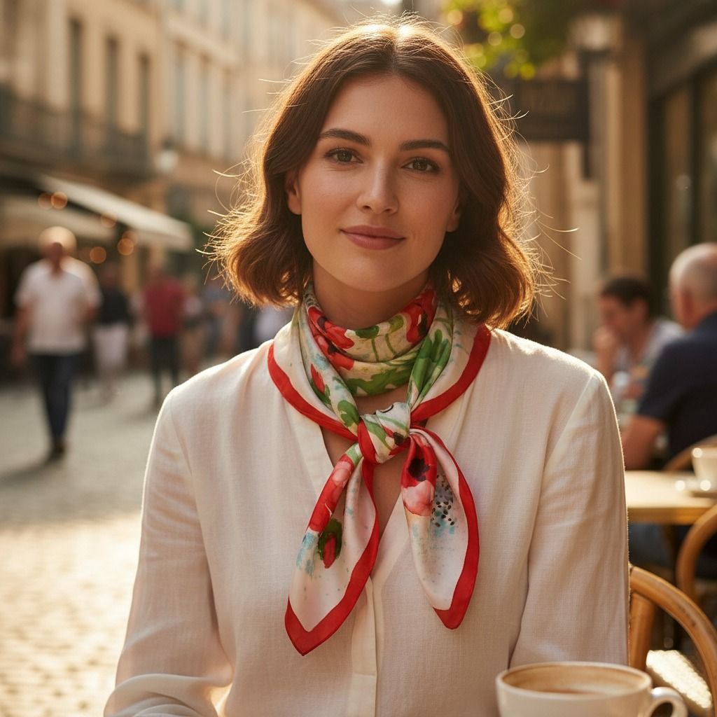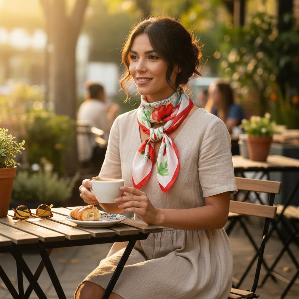 Hodvábna šatka 55 × 55 cm — jemný a ľahký doplnok s univerzálnym použitím. Skvele sa hodí ako šálik na krk, ozdoba do vlasov, mašľa na kabelku alebo štýlový detail k outfitu. Príjemná na dotyk, elegantná a ideálna ako malý, ale osobný dar.