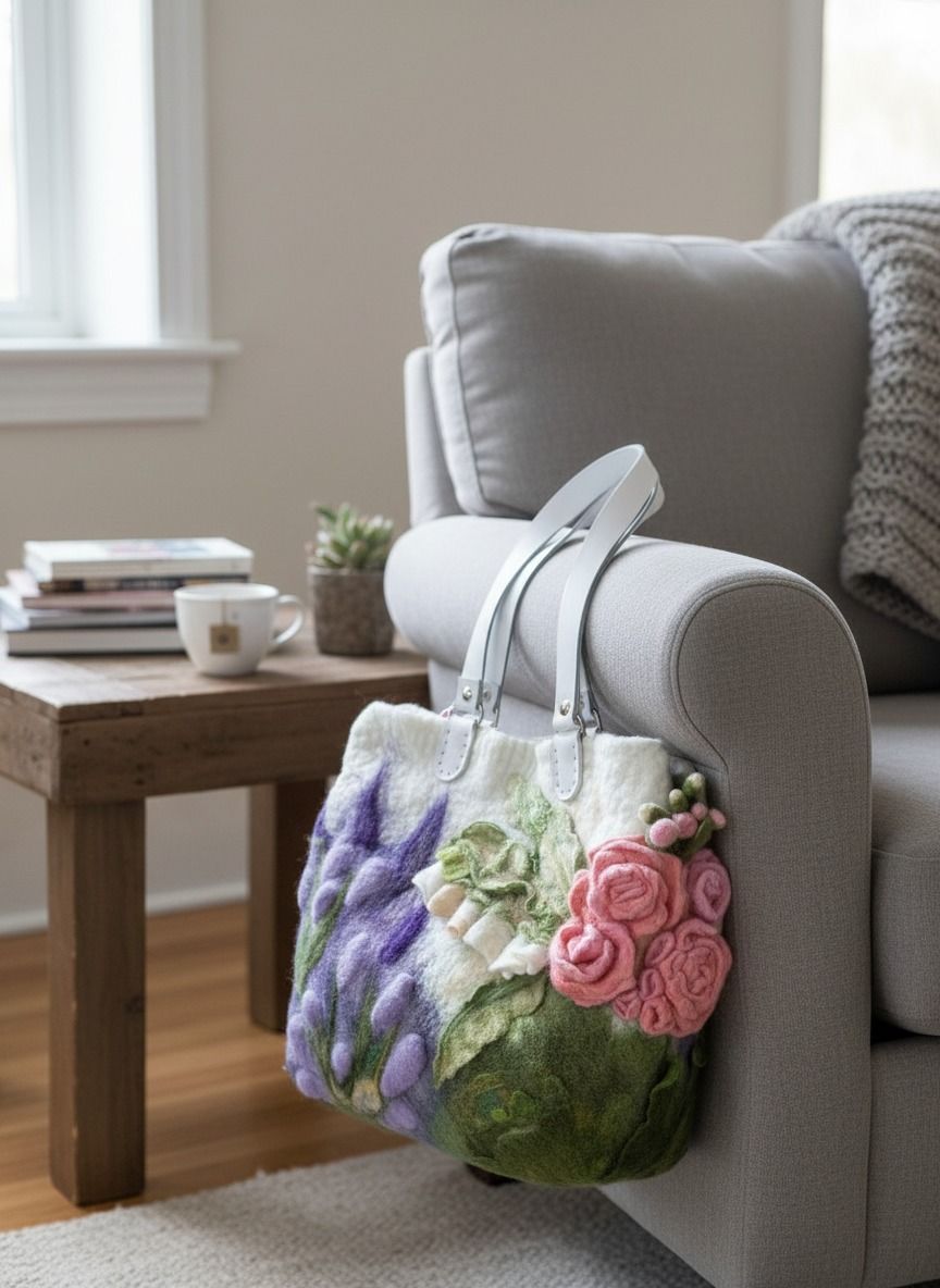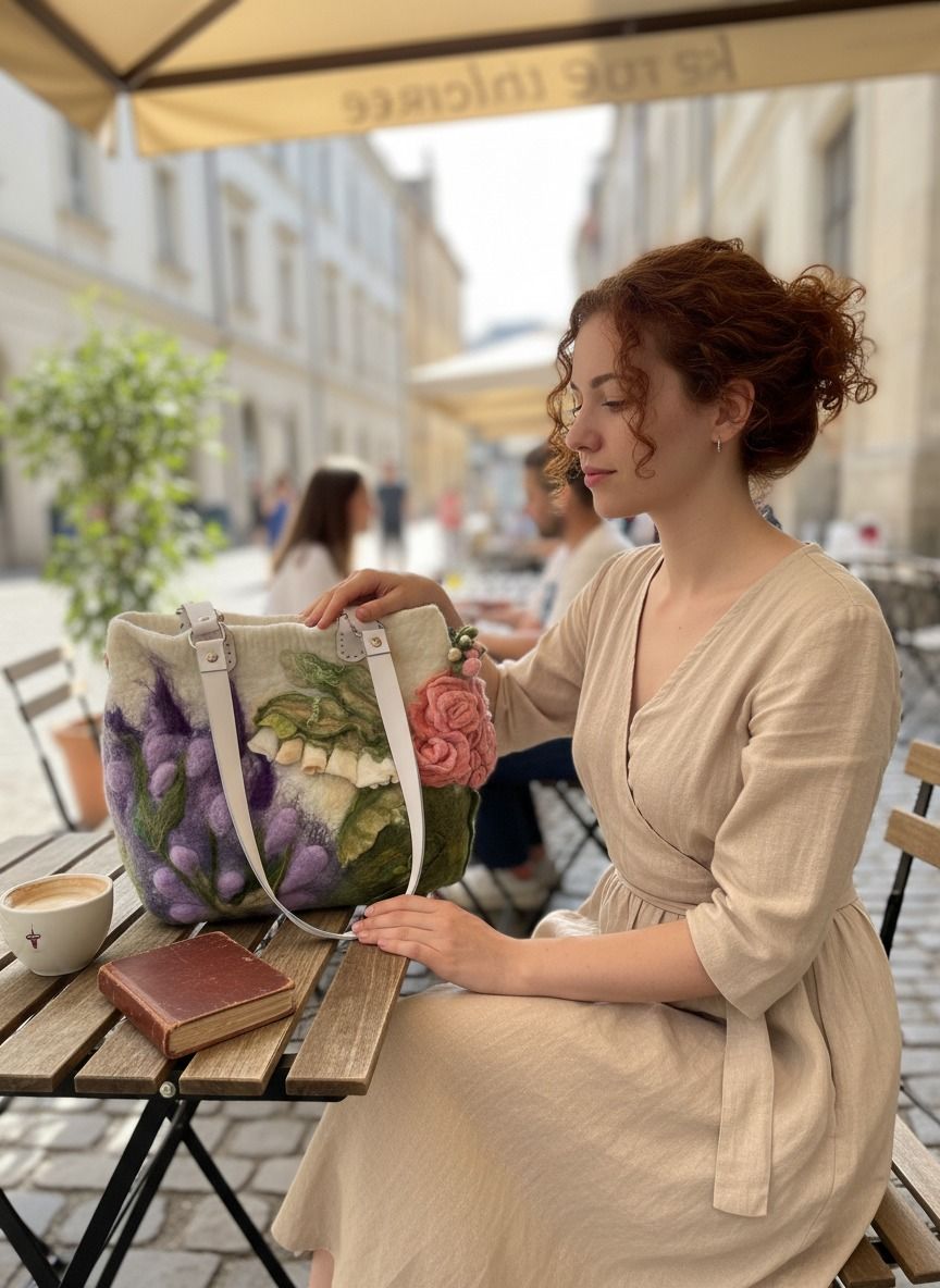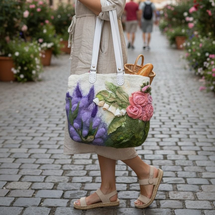 Krásna ručne plstená taška (35 × 39 cm) s jedným vnútorným vreckom — štýlový a praktický doplnok do mesta i na bežné nosenie. Originálny dizajn a pevná konštrukcia z plste zaručujú dlhú životnosť a jedinečný vzhľad, ktorý upúta pozornosť. Má aj obrovské množstvo milých detailov, ktoré ocenia najmä detailisti.