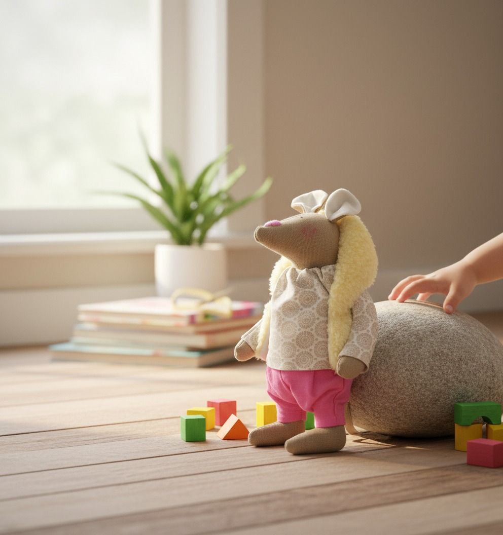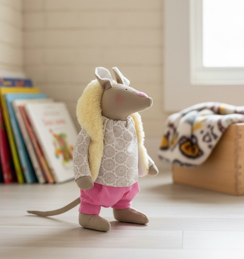 Ručne šitá myška Iveta vo výške 23 cm je jedinečný kúsok, ktorý vznikol s dôrazom na detail a kvalitu. Každá myška je originál – od samotného spracovania až po oblečenie z prírodných materiálov.
