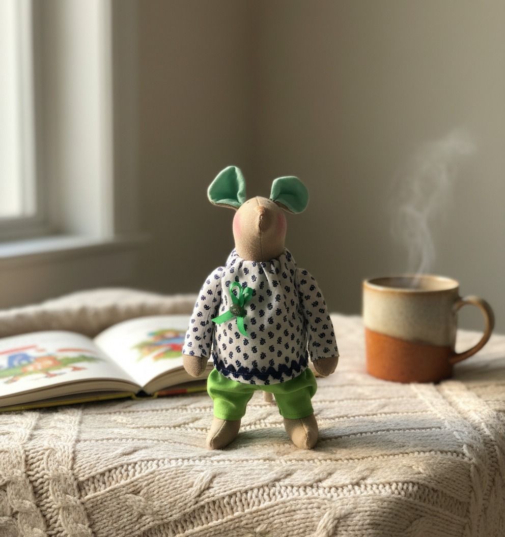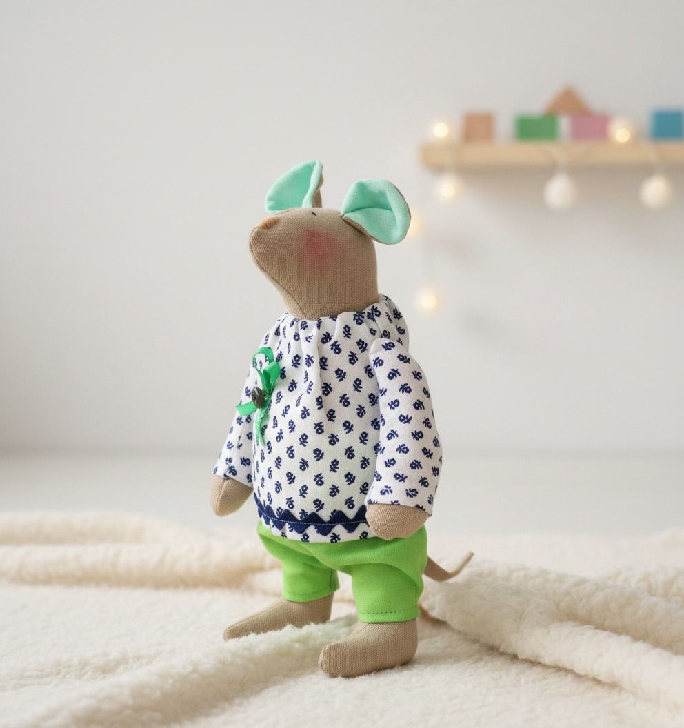 Ručne šitá myška Petra vo výške 23 cm je jedinečný kúsok, ktorý vznikol s dôrazom na detail a kvalitu. Každá myška je originál – od samotného spracovania až po oblečenie z prírodných materiálov.