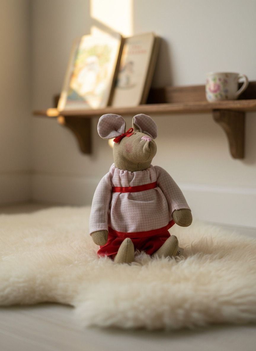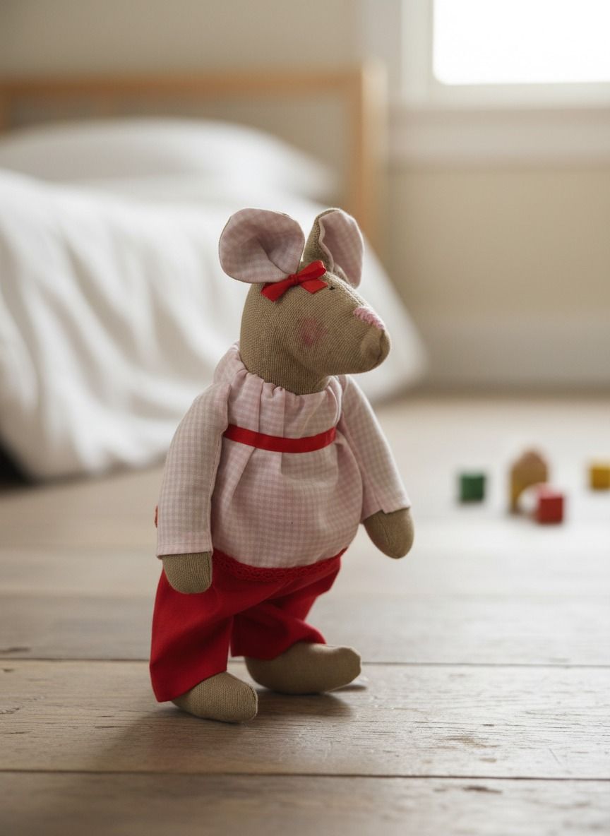 Ručne šitá myška Yvona vo výške 23 cm je jedinečný kúsok, ktorý vznikol s dôrazom na detail a kvalitu. Každá myška je originál – od samotného spracovania až po oblečenie z prírodných materiálov.
