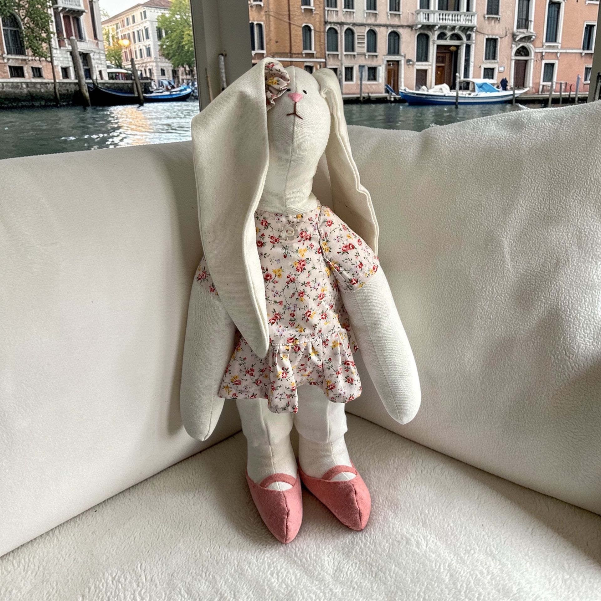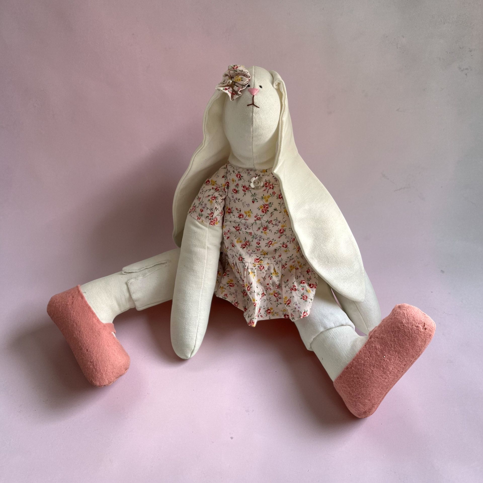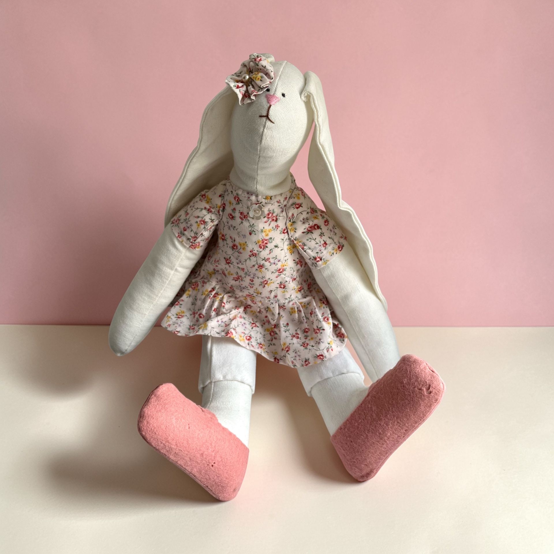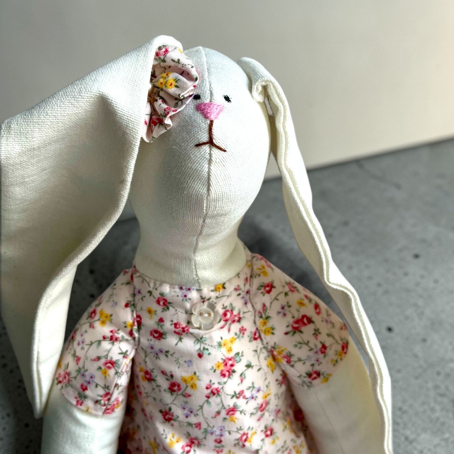 Ručne šitý originál vysoký približne 30 cm, ktorý sa síce tvári ako plyšová hračka, no v skutočnosti je to malá osobnosť s vlastným štýlom. Elegantne oblečená, s precíznymi detailmi – pokojne by mohla vyraziť na čaj o piatej, vernisáž alebo aj na tajné stretnutie umeleckých zajačíc.