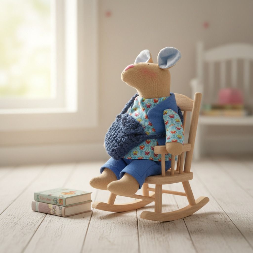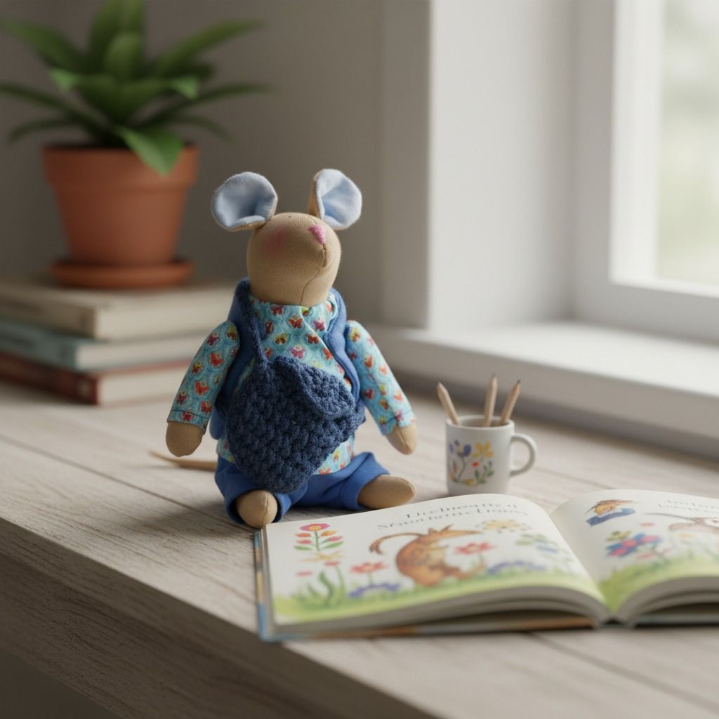 Ručne šitá myšiak Jean vo výške 23 cm je jedinečný kúsok, ktorý vznikol s dôrazom na detail a kvalitu. Každý myšiak je originál – od samotného spracovania až po oblečenie z prírodných materiálov.