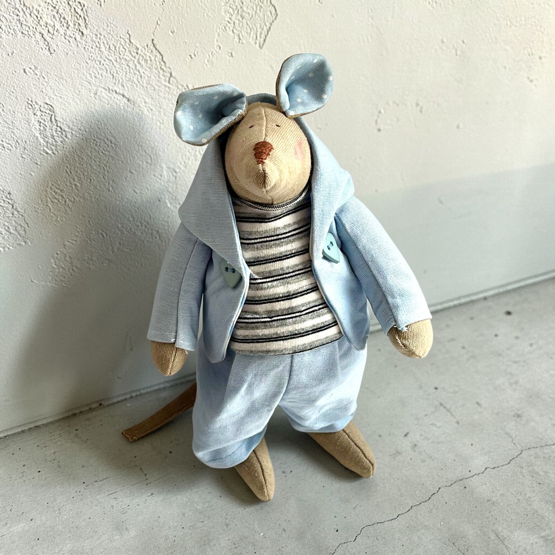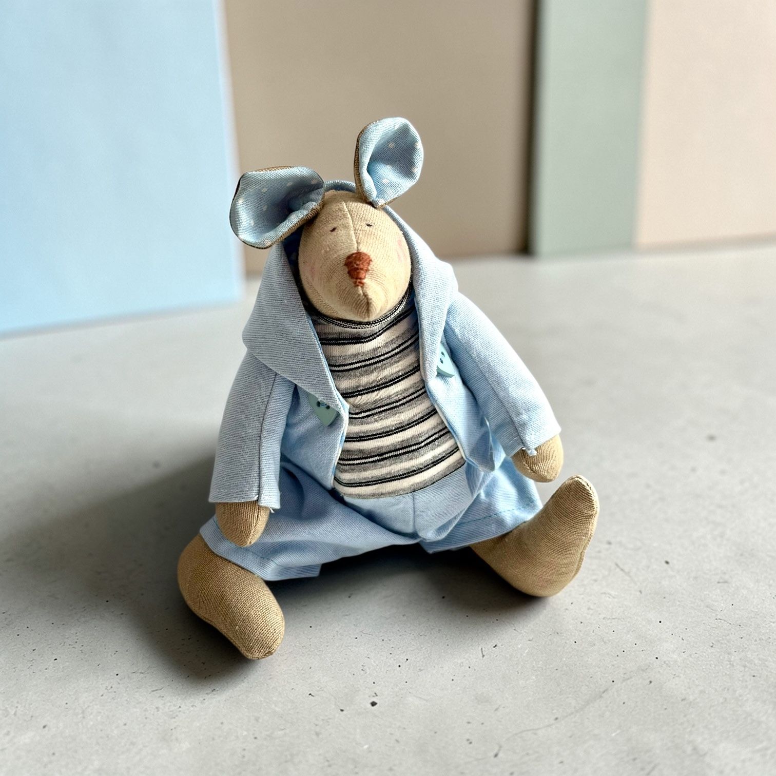 Ručne šitá myšiak Juane vo výške 23 cm je jedinečný kúsok, ktorý vznikol s dôrazom na detail a kvalitu. Každý myšiak je originál – od samotného spracovania až po oblečenie z prírodných materiálov.