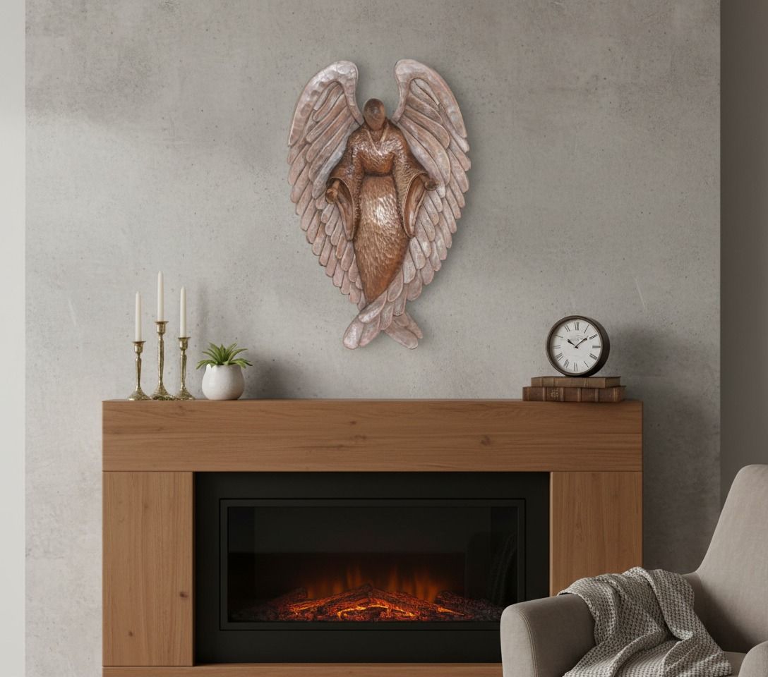 Precízne ručne vyrezávaná drevorezba od manželov Šinalovcov – Archanjel Gabriel. Vyrezané z poctivého lipového dreva, mierne morené a ošetrené voskom, čo zvýrazňuje kresbu dreva a dodáva dielu teplý, prírodný vzhľad. Rozmery: výška cca 53 cm, šírka cca 65 cm. Vhodná na zavesenie na stenu ako originálna dekorácia do obývačky, predsiene alebo do galérie zberateľa.
