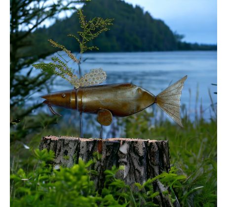 Oceľ - industriálne umenie, úžasná rybka oživí trávník, dĺžka 57 cm.