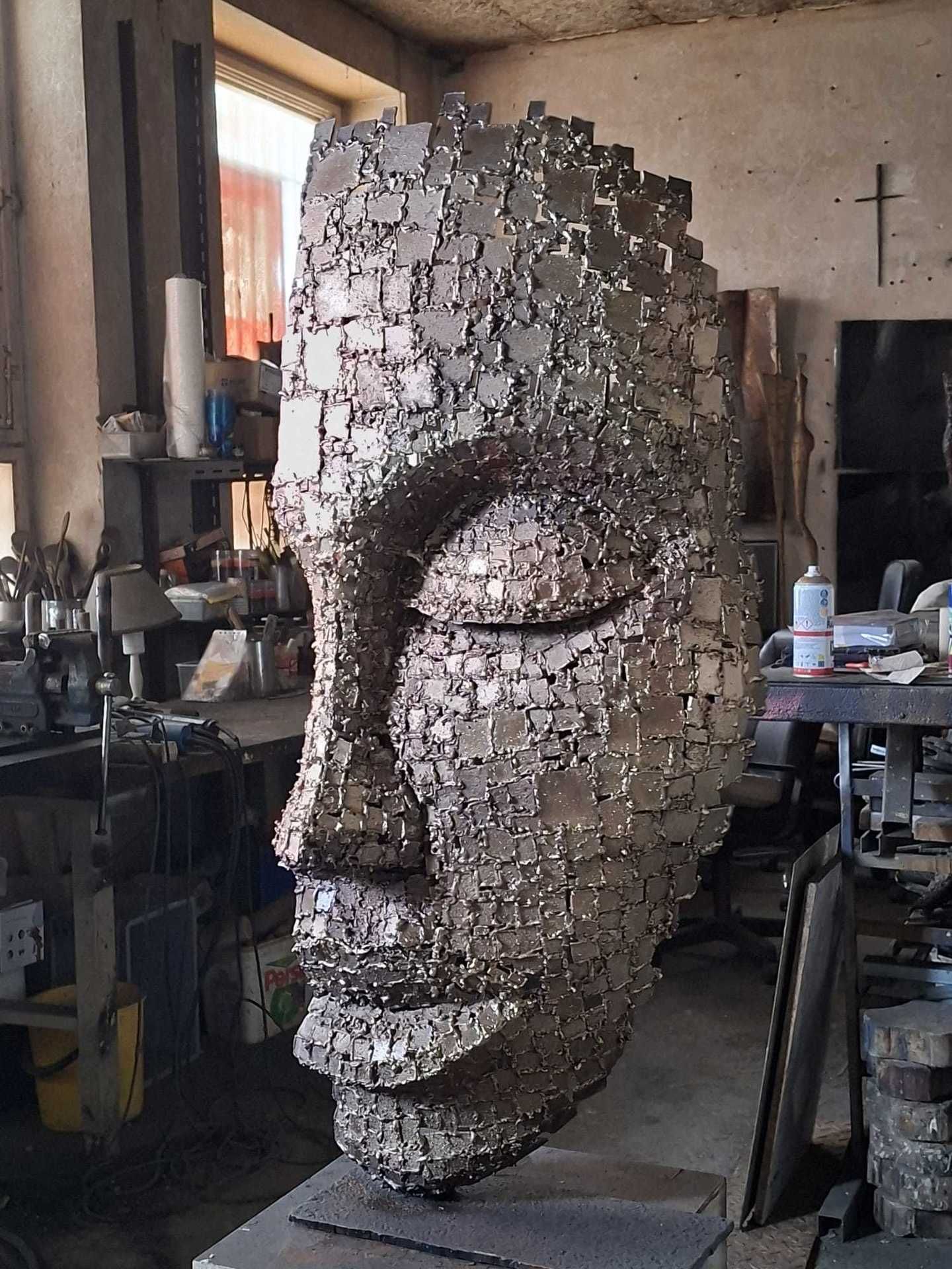 Plastika. Základným prvkom je oceľ rozrezaná na stovky či tisíce fragmentov, vrstvená, zváraná, pálená, spájaná do hutnej mozaiky, natreté medenou farbou. Výška 1 m.