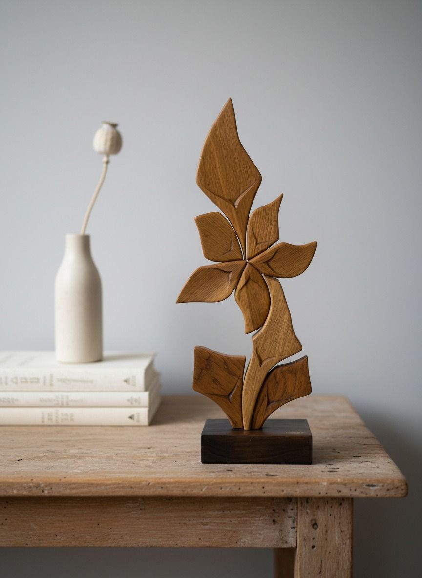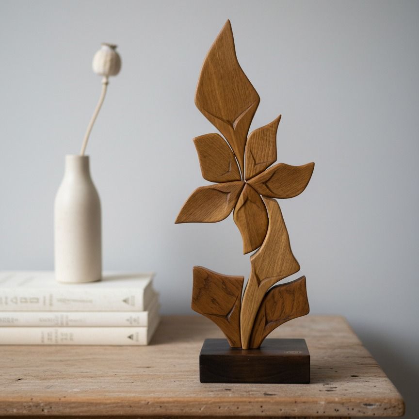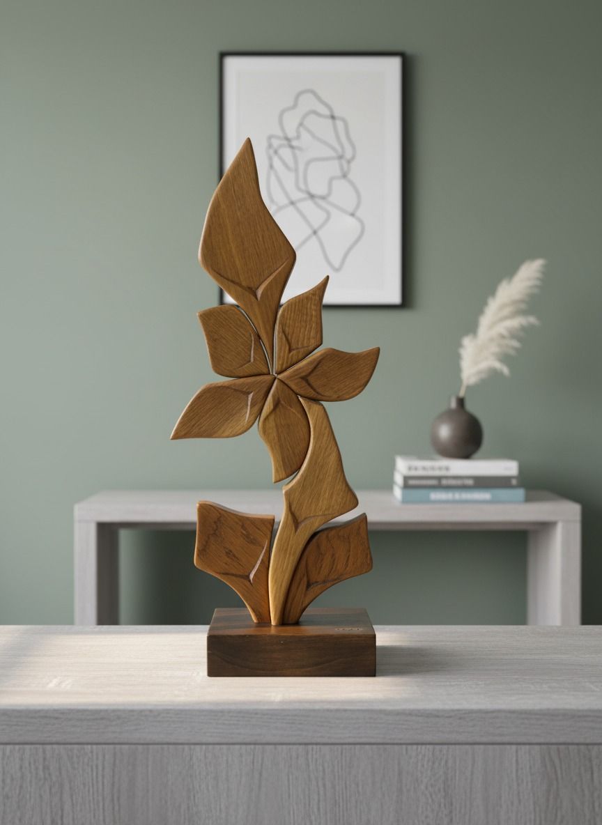 Jemné umelecké dielo z voskovaného dreva, dub, od výtvarníka Róbert Cyprich na drevenom podstavci znázorňuje rastliný motív púpava. Výška plastiky je 63 cm.